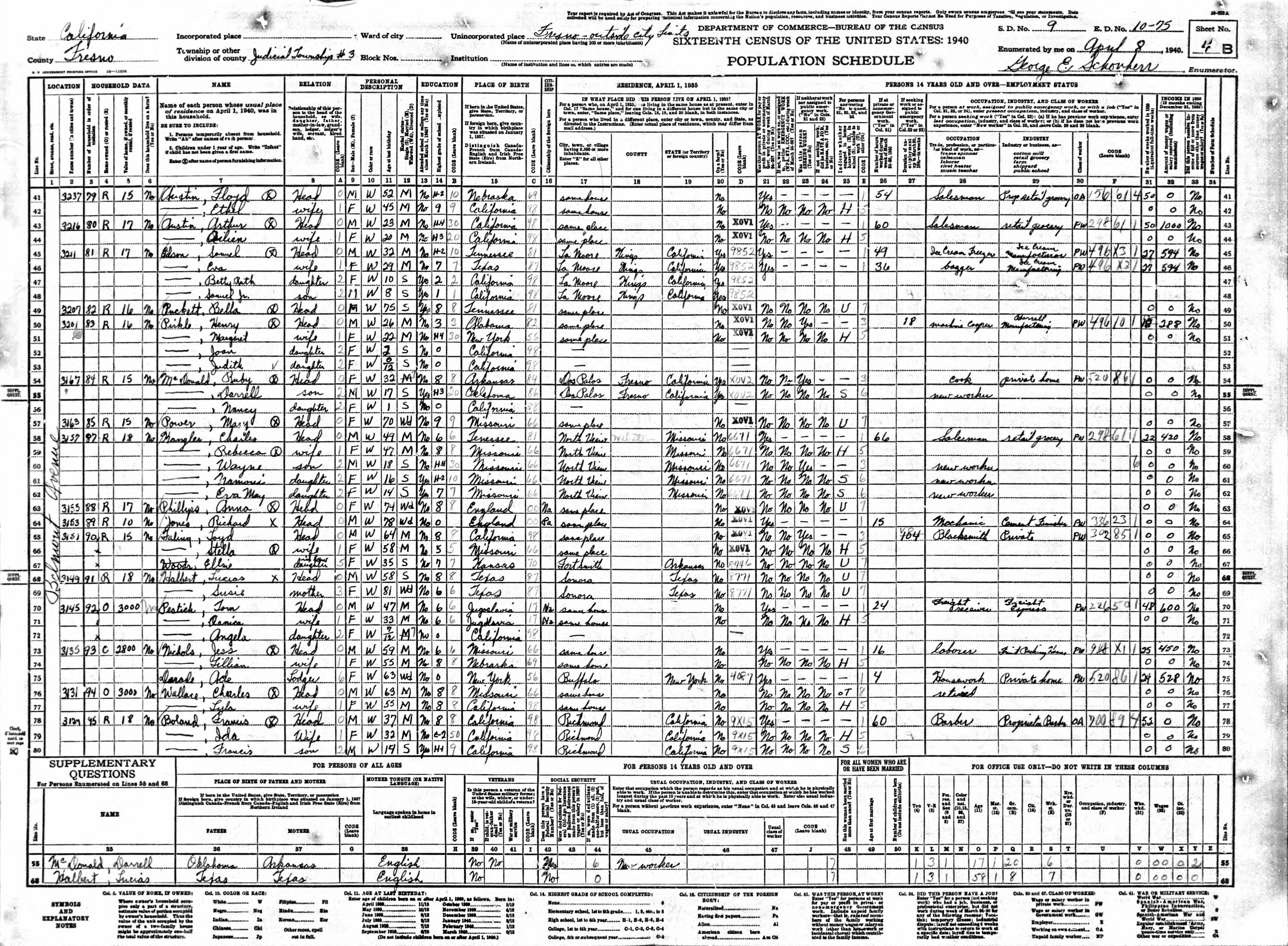 Pirkle Family 1940 Federal Census California, Lines 50-53