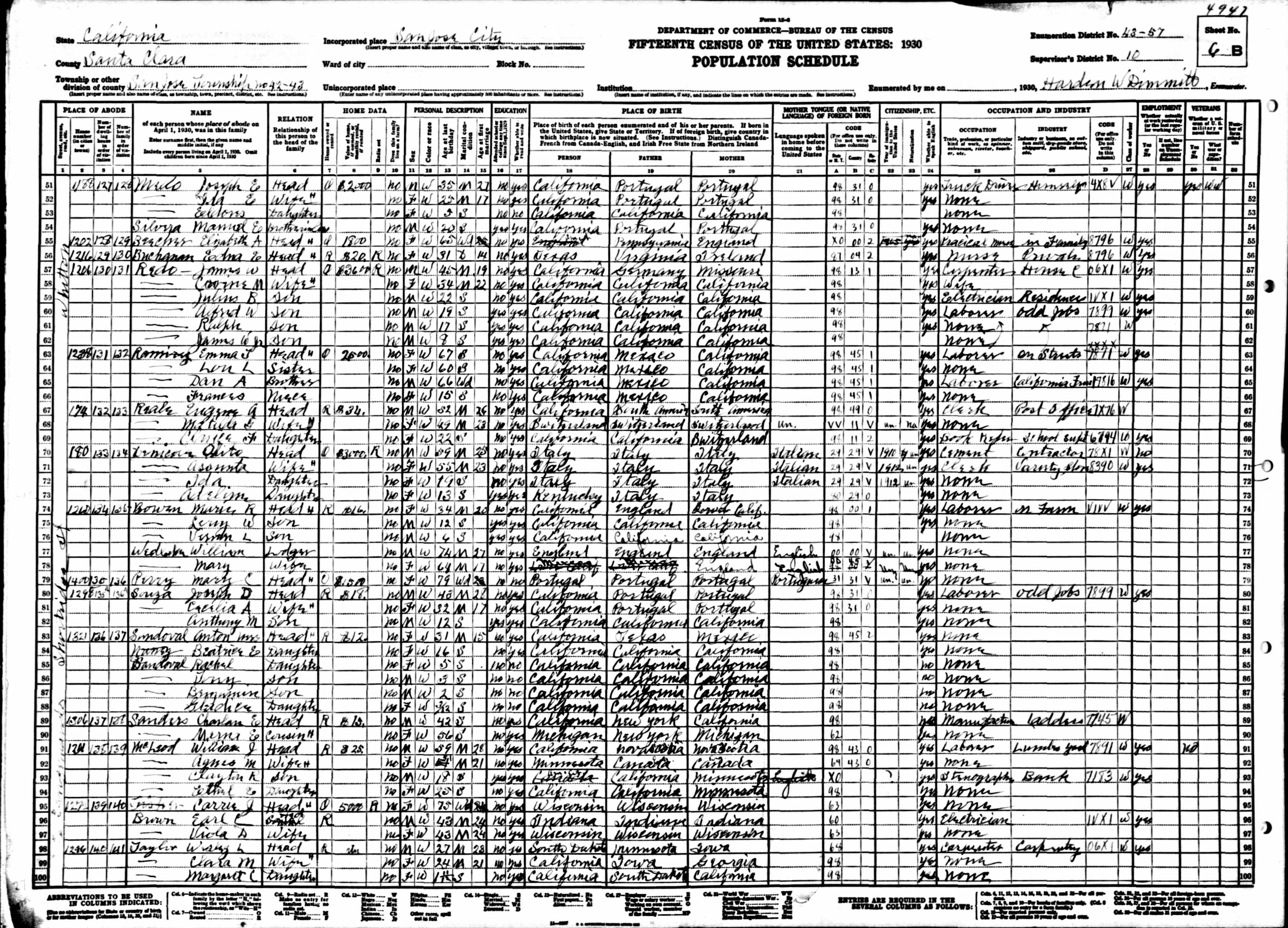 Sandoval Family 1930 Federal Census California, Lines 89-88