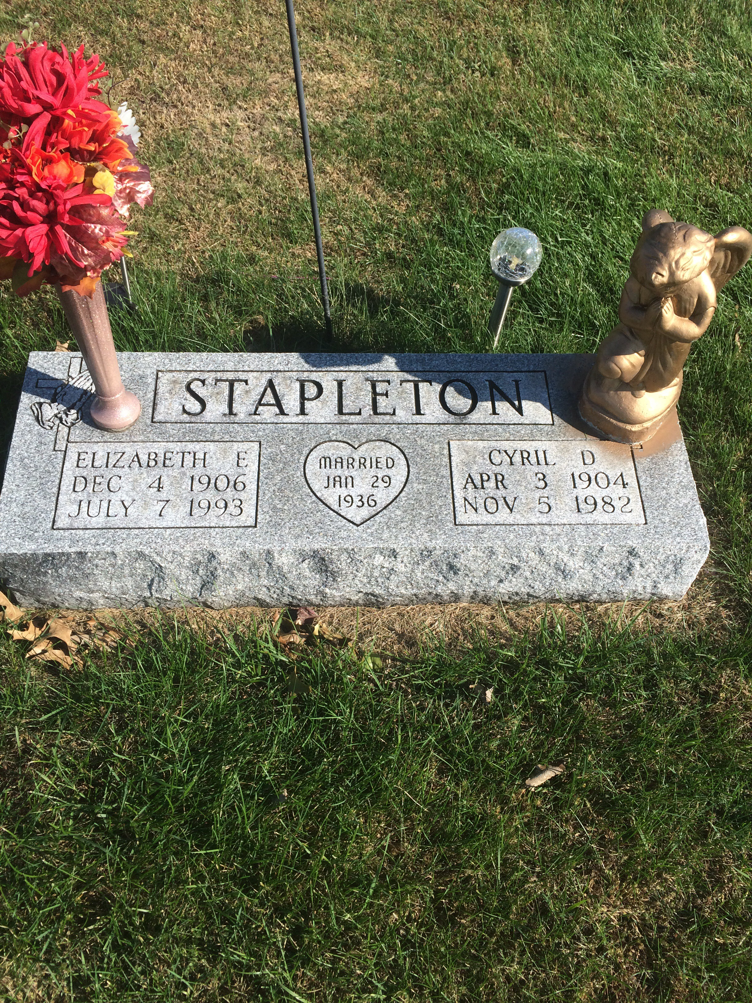 Cyril Dennis Stapleton were married on January 29, 1936 in Christian, Illinois, USA. She died on July 7, 1993, at age 86, in Christian, Illinois, USA. She was buried in Saint Marys Cemetery, Assumption, Illinois.
