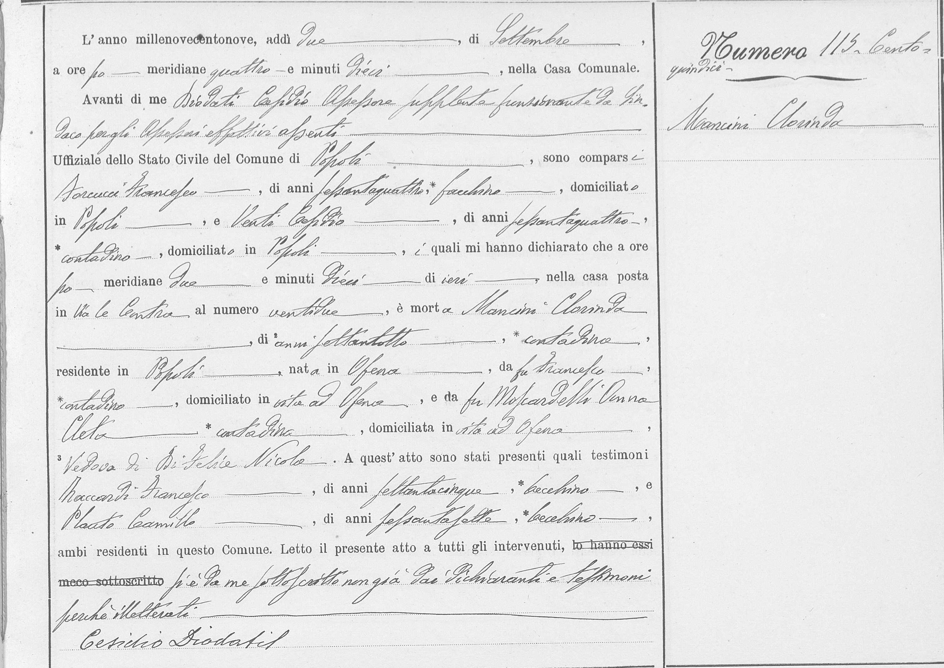 Prudenza Mancini was born in 1841 in Ofena, L'Aquila, Abruzzo, Italy. She and