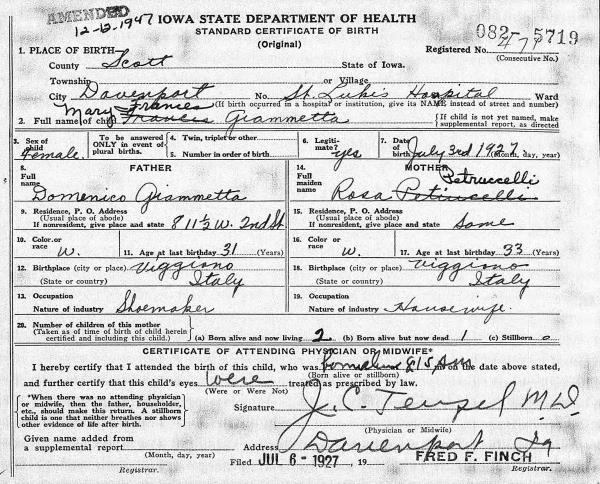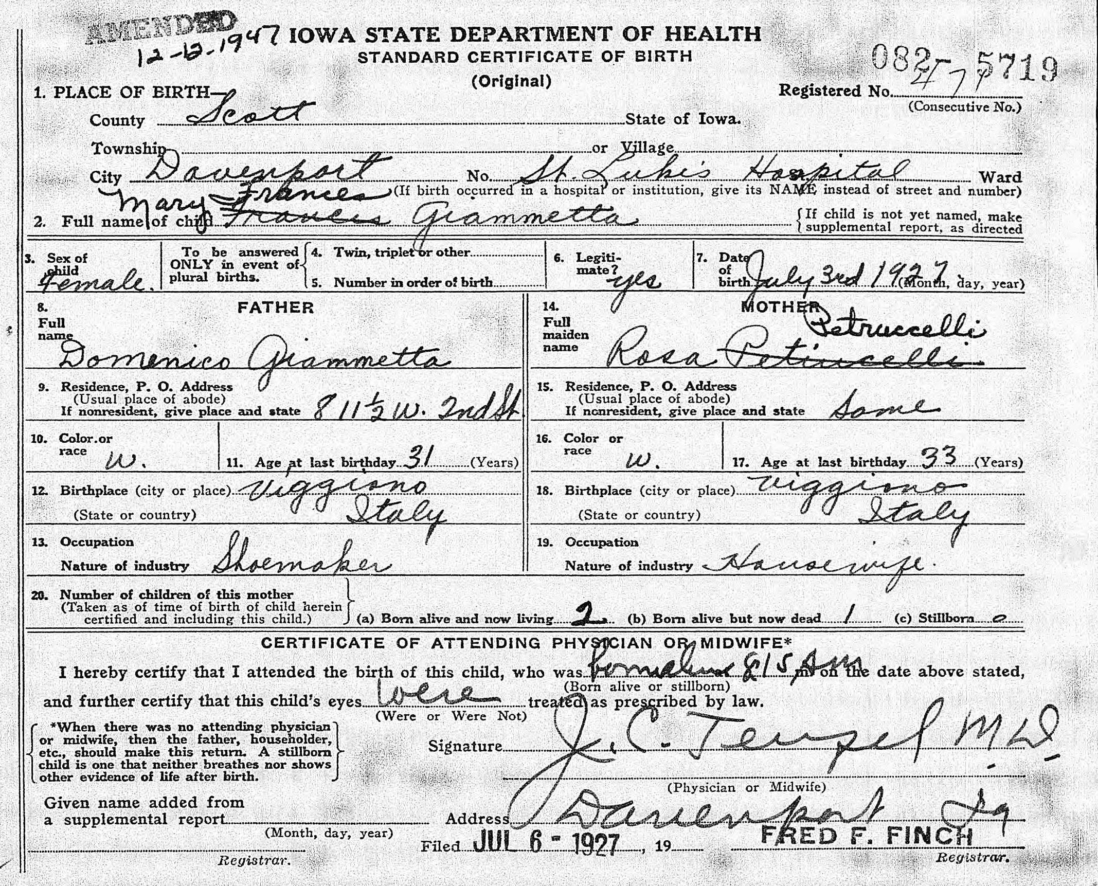 Mary Frances Giammetta was born on July 3, 1927 in Davenport, Scott, Iowa, USA. She and