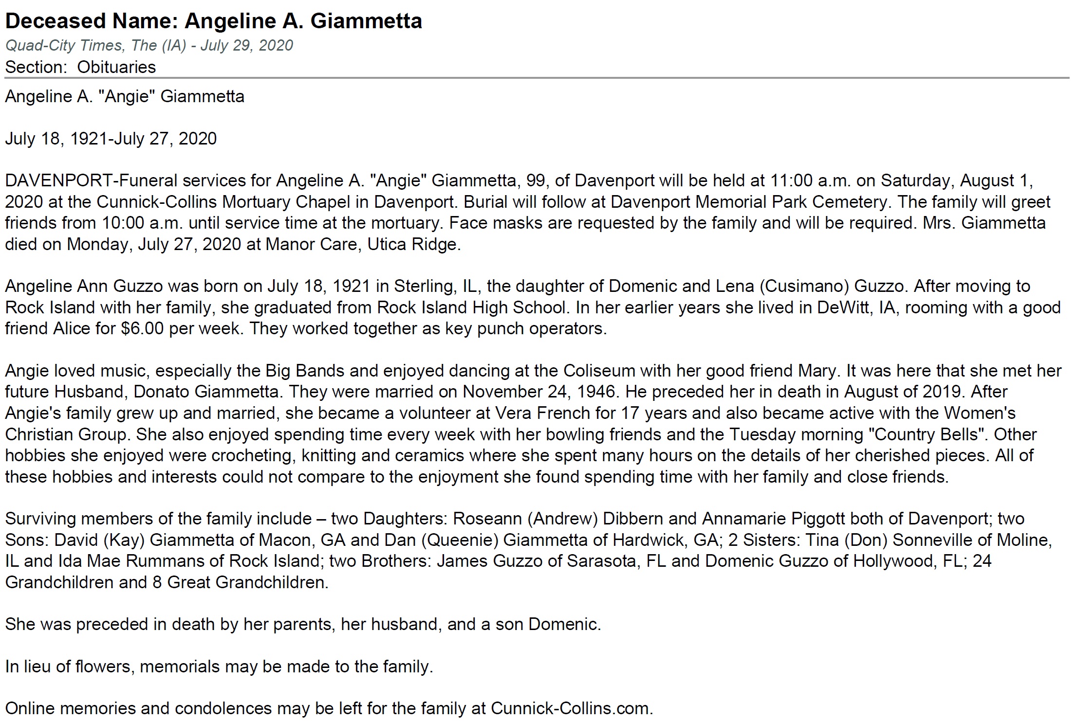 | Daughter | Angeline Ann Guzzo Born: July 18, 1921, Died: July 27, 2020 |
