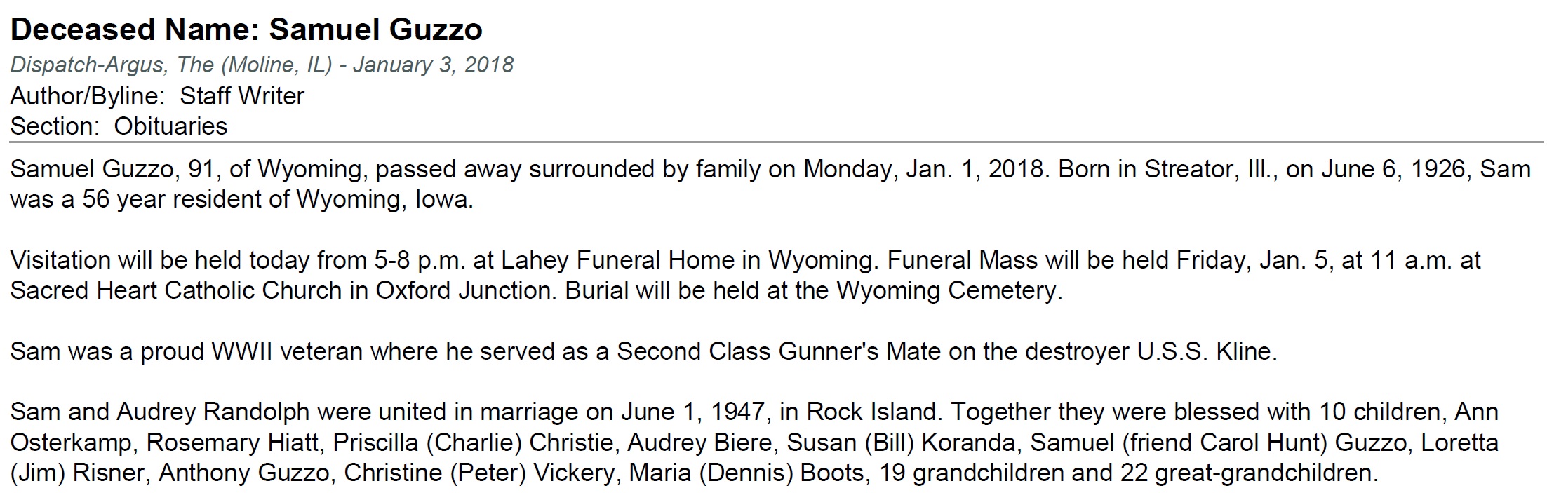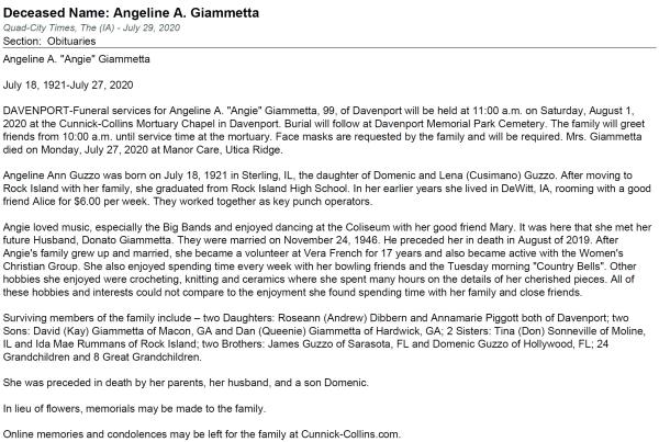 Angeline Ann Guzzo were married on November 24, 1946 in Davenport, Scott, Iowa, USA. He died on August 7, 2019, at age 94, in Davenport, Scott, Iowa, USA. He was buried in Davenport Memorial Park, Davenport, Iowa.