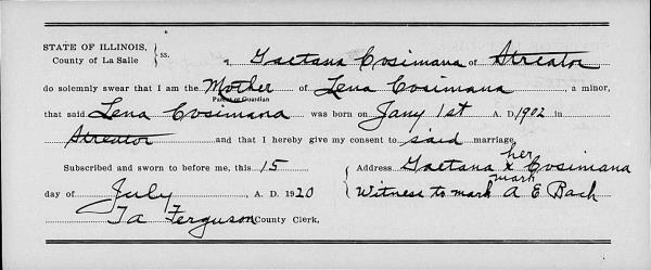Antonia Lena Cusimano were married on July 29, 1920 in Streator, LaSalle, Illinois, USA. He and