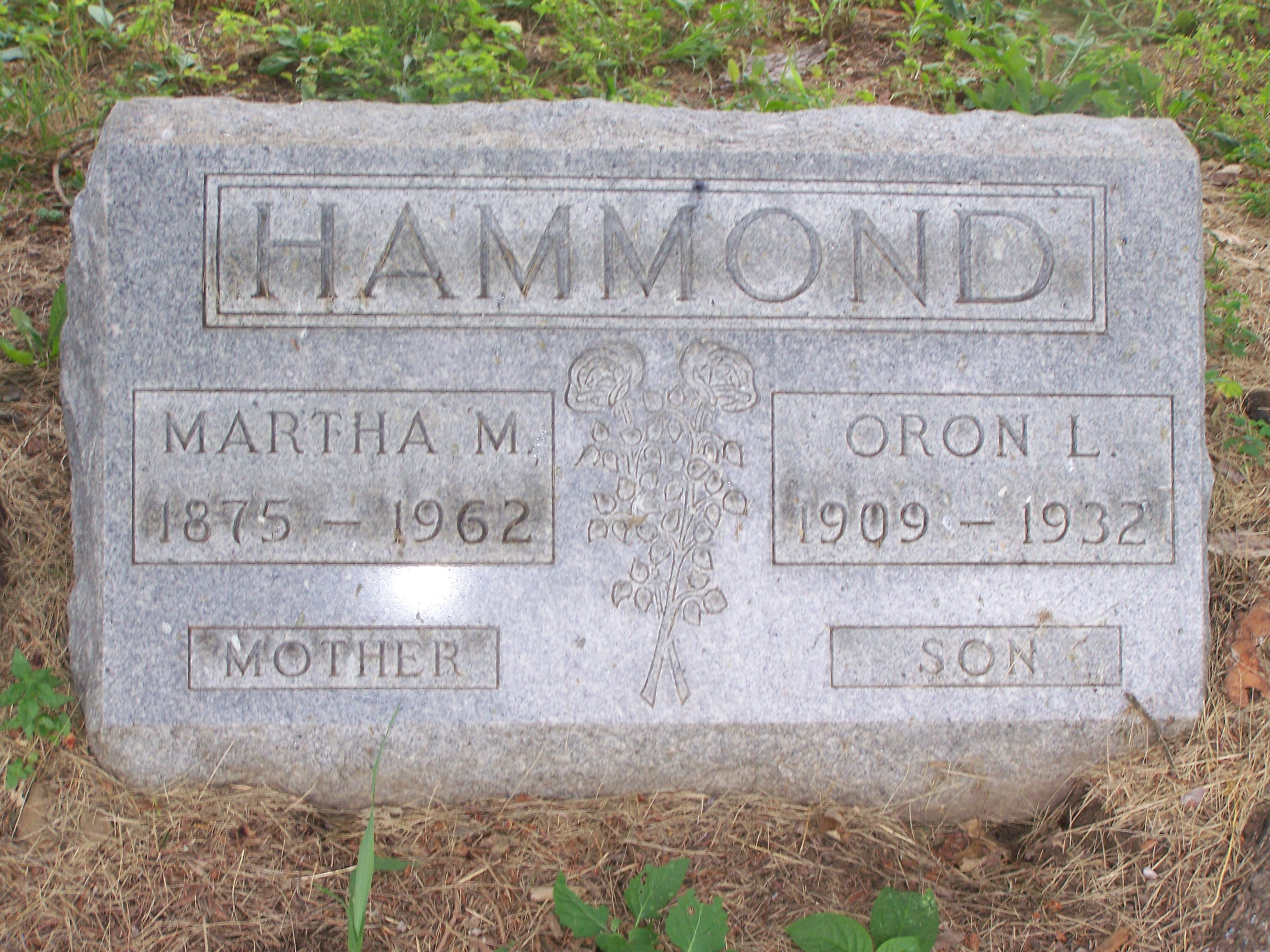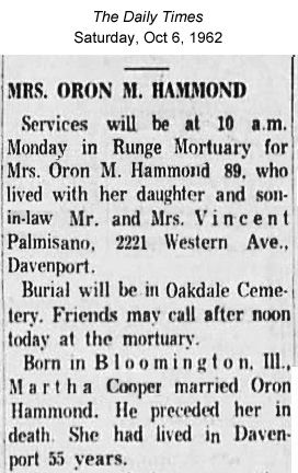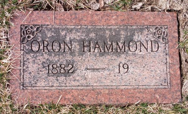 Oron Hammond were married. She died on October 5, 1962, at age ~87, in Davenport, Scott, Iowa, USA. She was buried in Oakdale Memorial Gardens, Davenport, Iowa.