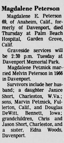 Melvin Peterson were married in 1966 in Davenport, Scott, Iowa, USA. She died on August 7, 1980, at age 68, in Garden Grove, Orange, California, USA. She was buried in Davenport Memorial Park, Davenport, Iowa.