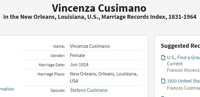 Stefano Cusimano were married on June 30, 1924 in New Orleans, Louisiana, USA. She died on September 17, 1961, at age 78, in Chicago, Cook, Illinois, USA. She was buried in Elmwood Cemetery and Mausoleum, River Grove, Illinois.