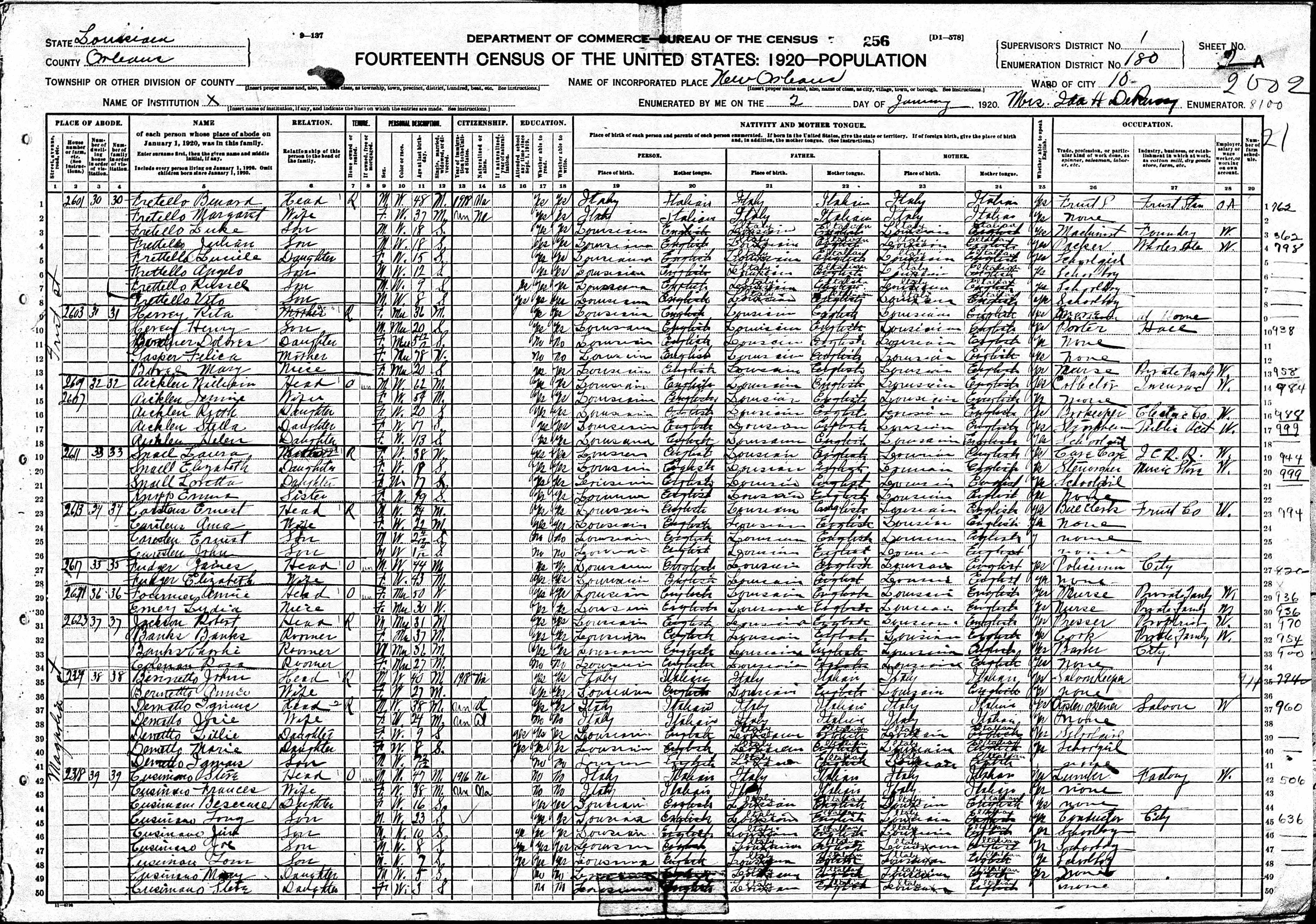 Cusimano Family 1920 Federal Census Louisiana, Lines 42-50
