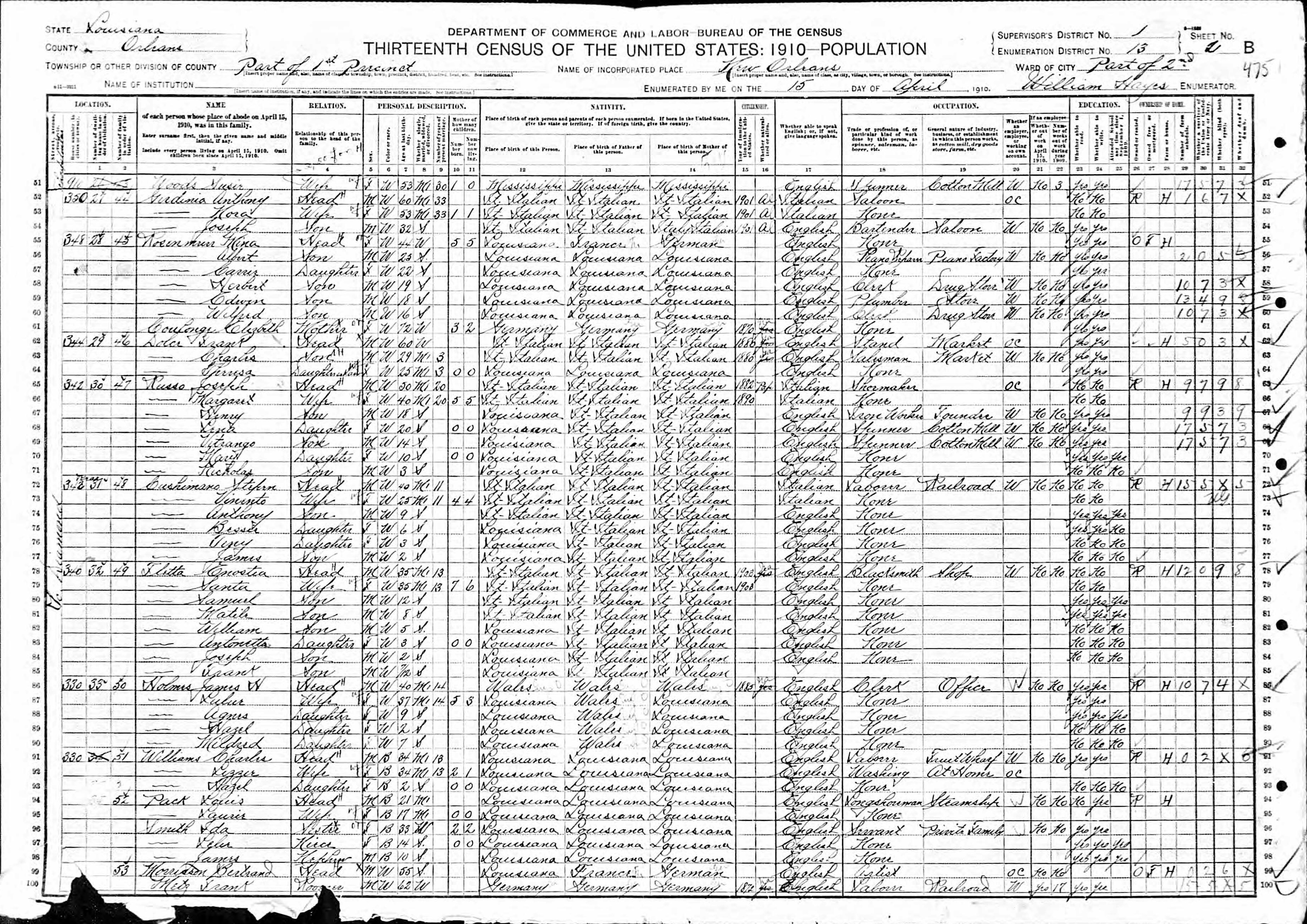 Cusimano Family 1910 Federal Census Louisiana, Lines 72-77