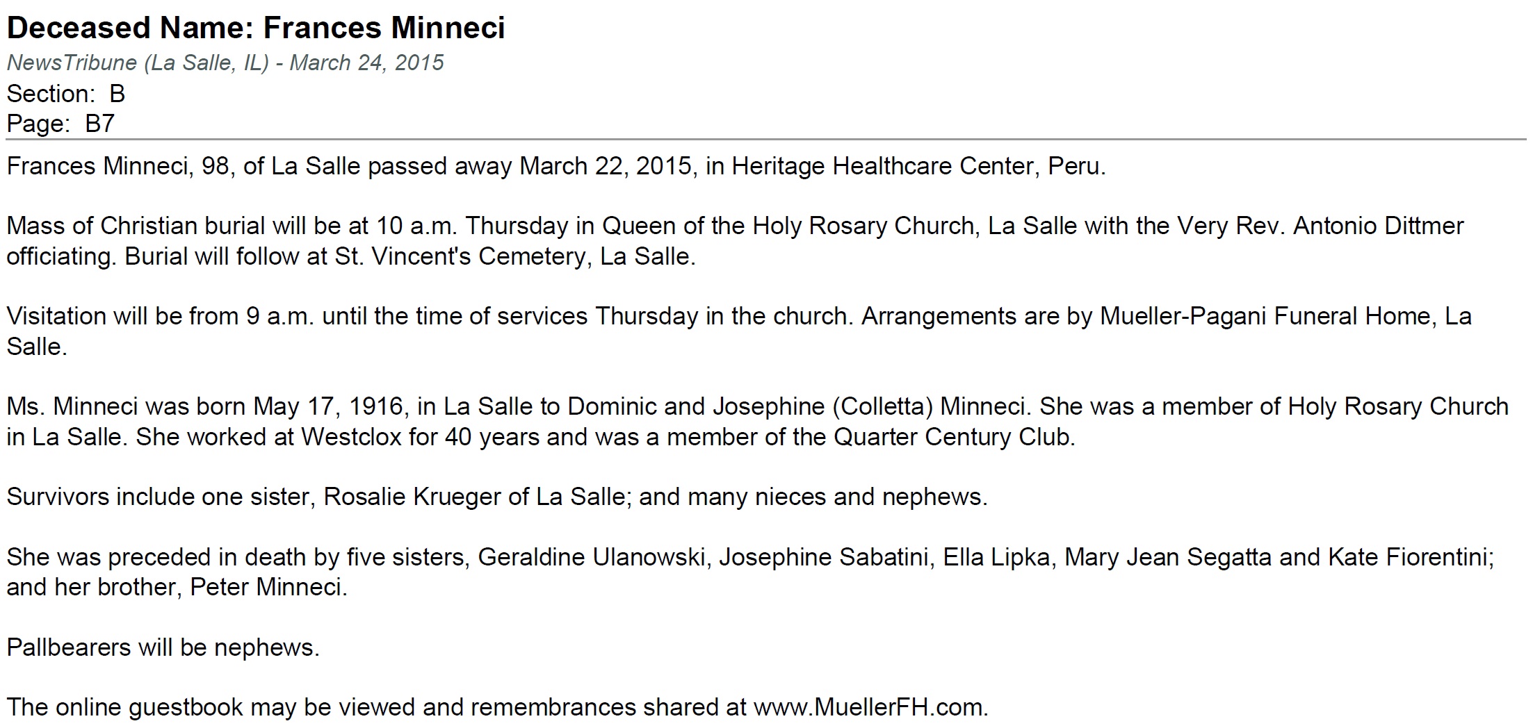 Frances Minneci was born on May 17, 1916 in LaSalle, LaSalle, Illinois, USA. She died on March 22, 2015, at age 98, in Peru, LaSalle, Illinois, USA. She was buried in St. Vincent's Cemetery, LaSalle, Illinois.