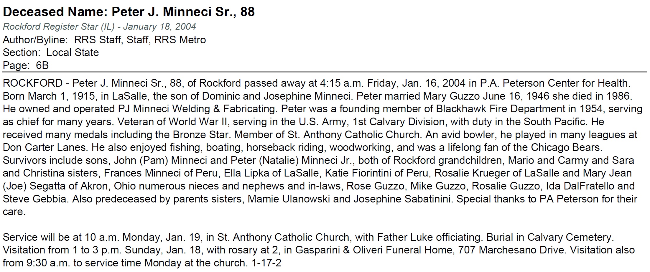 | Son | Peter J. Minneci, Sr. Born: March 1, 1915, Died: January 16, 2004 |