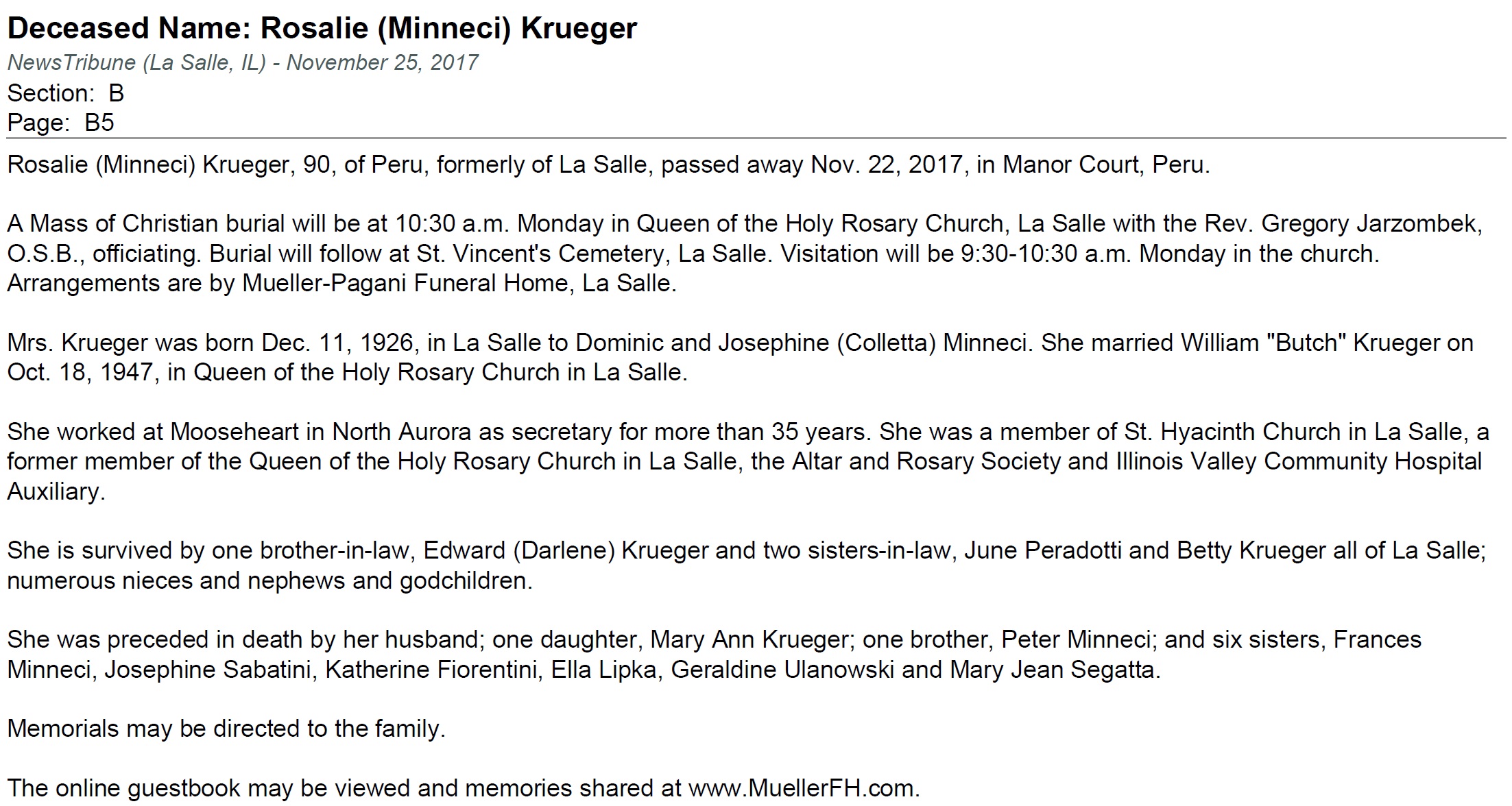 William "Butch" Krueger were married on October 18, 1947 in LaSalle, LaSalle, Illinois, USA. She died on November 22, 2017, at age 90, in Peru, LaSalle, Illinois, USA. She was buried in St. Vincent's Cemetery, LaSalle, Illinois.