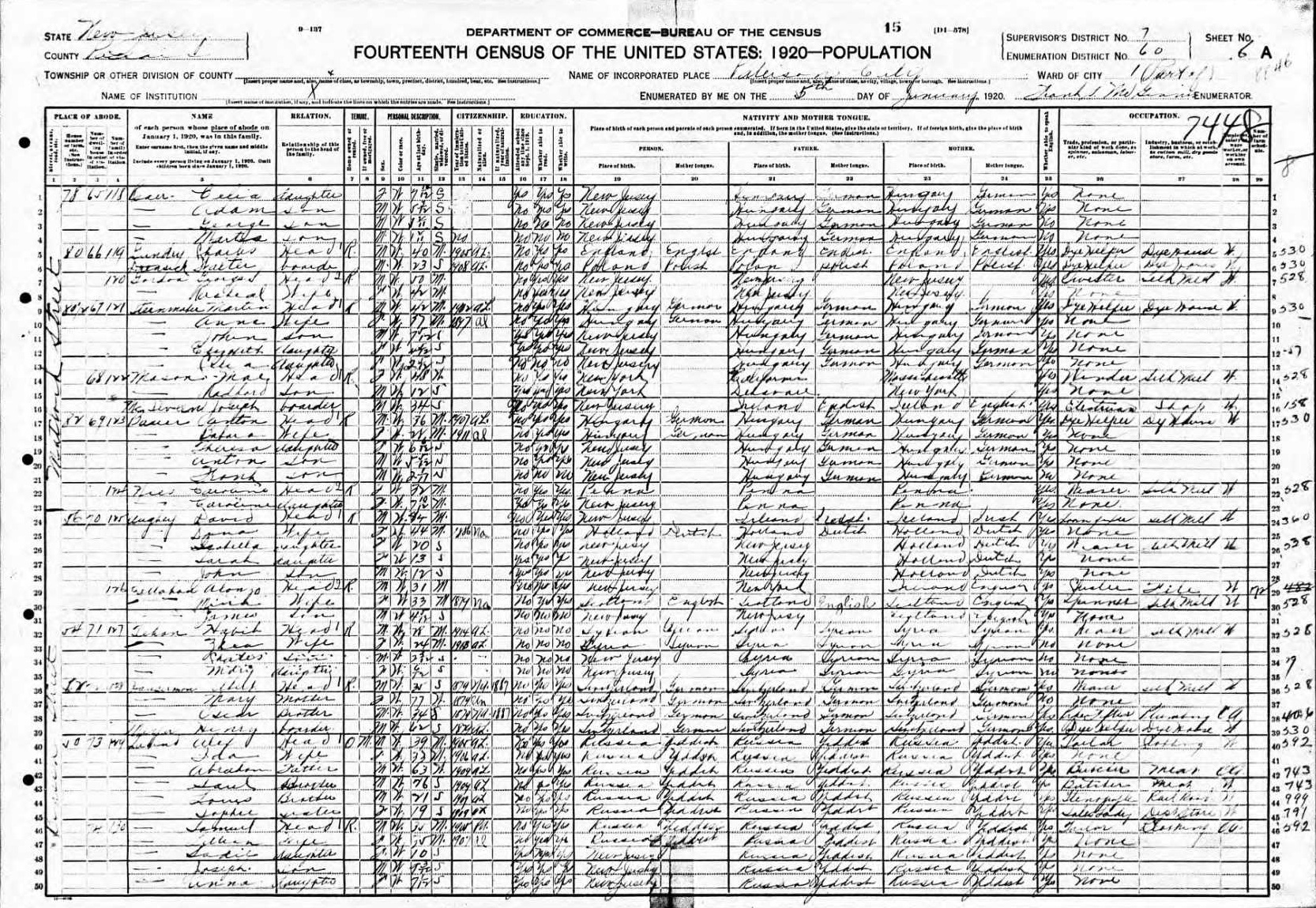 Czubat Family 1920 Federal Census New Jersey, Lines 43-49