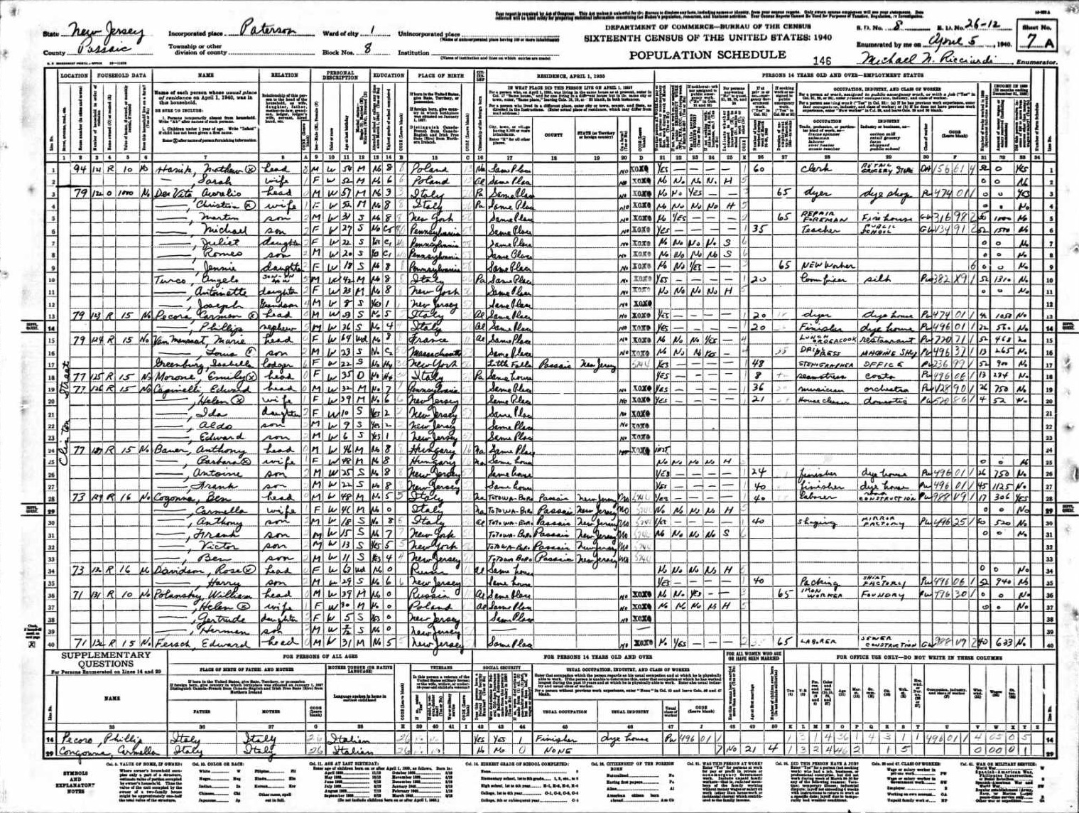 La Costa Family 1940 Federal Census New Jersey, Lines 71-75
