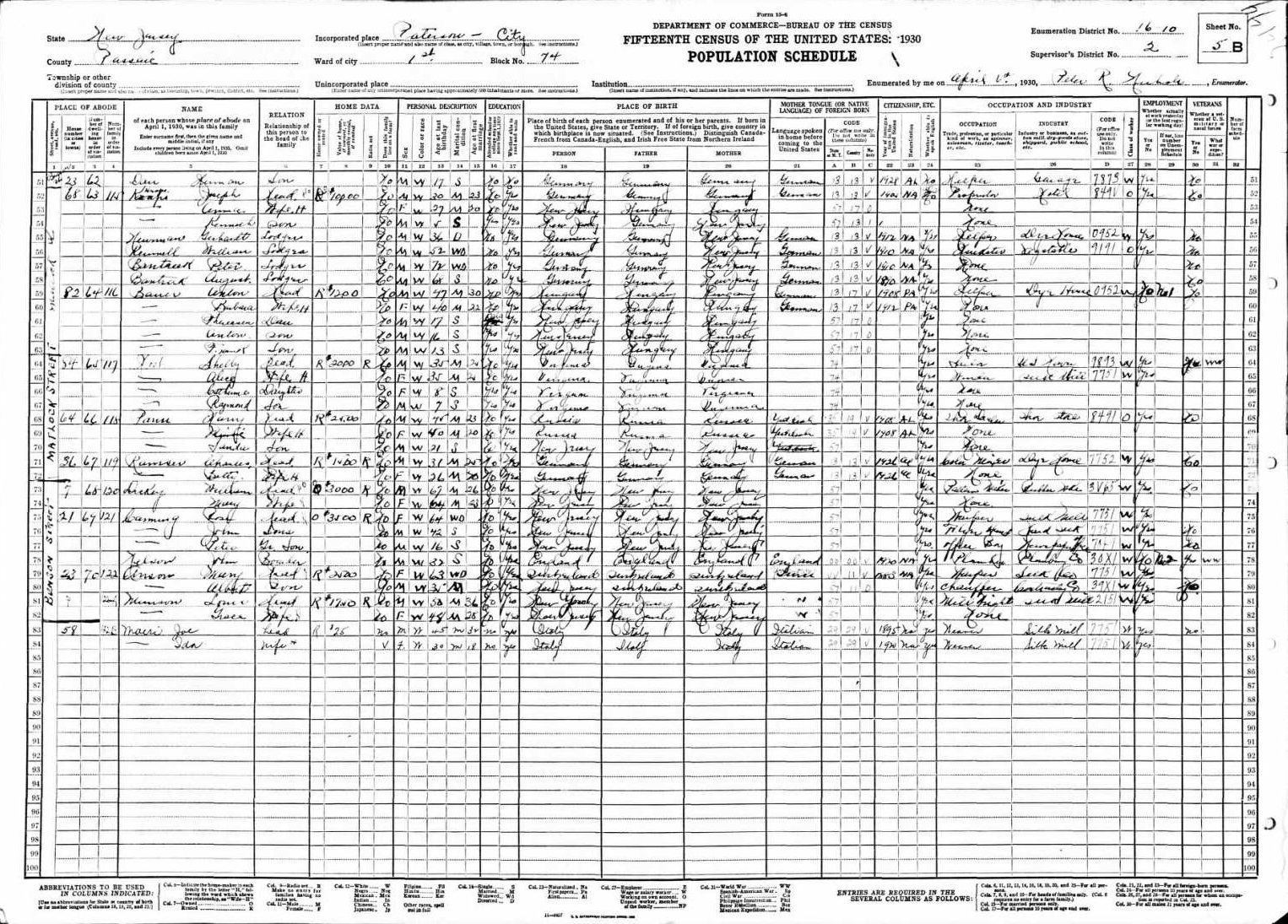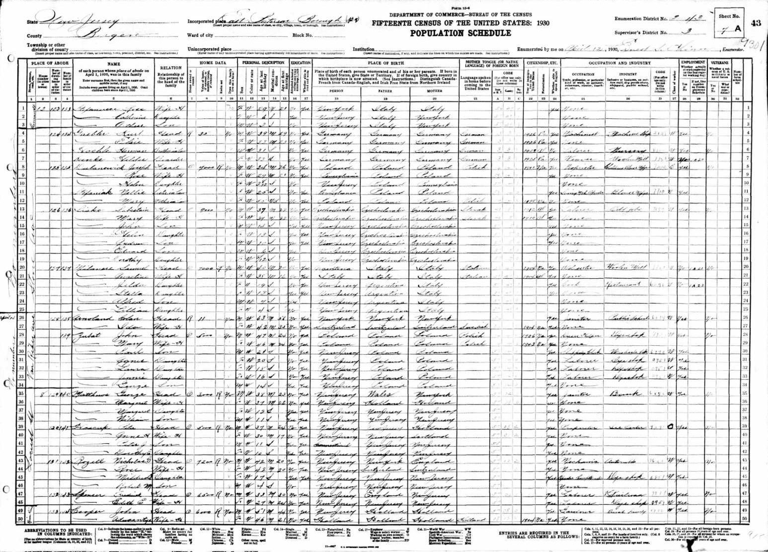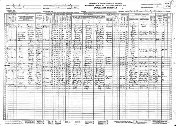 Bauer Family 1930 Federal Census New Jersey, Lines 59-63