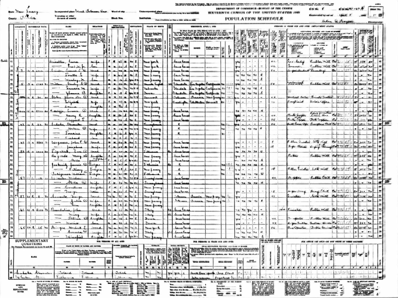 Brandalise Family 1940 Federal Census New Jersey, Lines 74-77