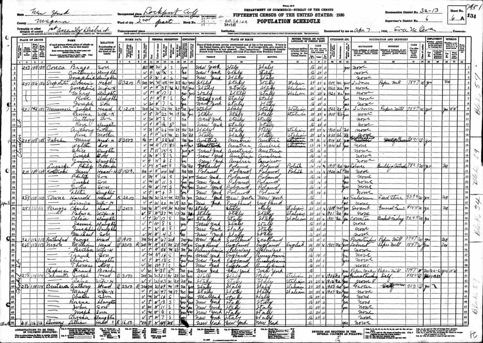 Scapelliti Family 1930 Federal Census New York, Lines 4-8