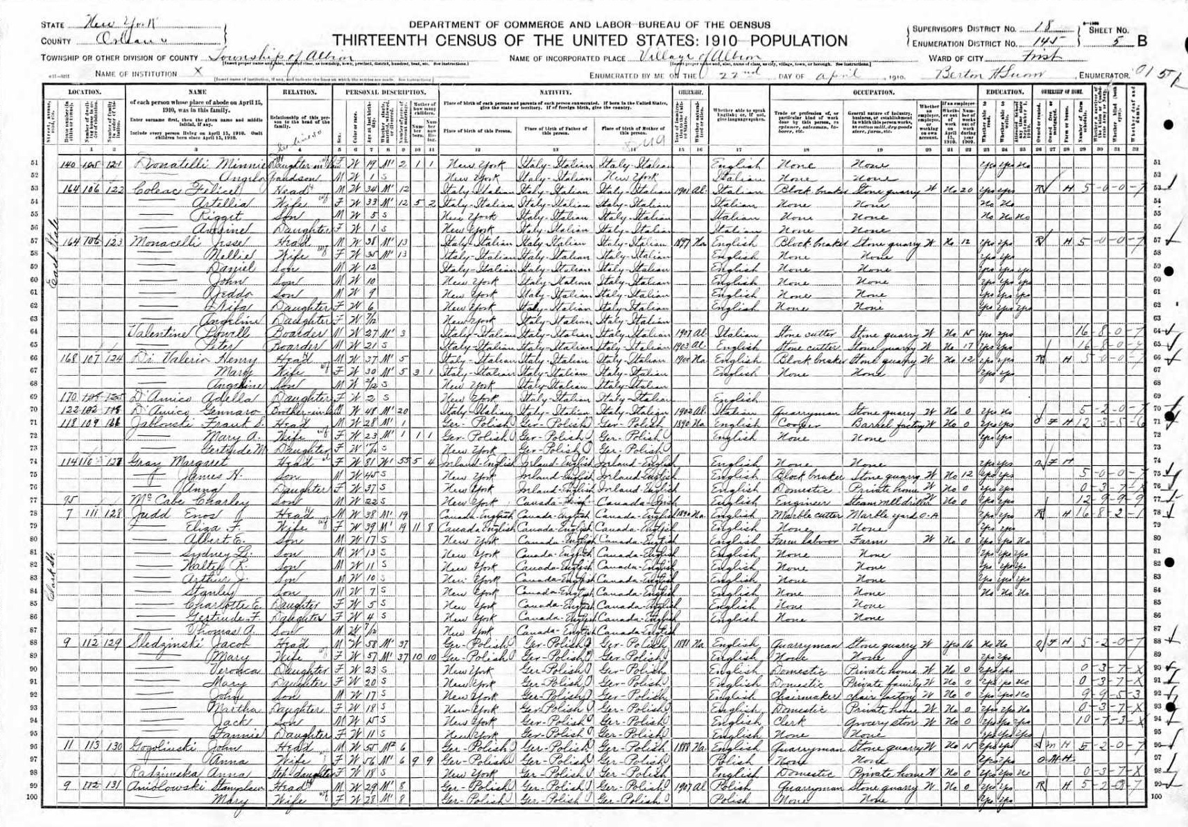 Monacelli Family 1910 Federal Census New York, Lines 57-63