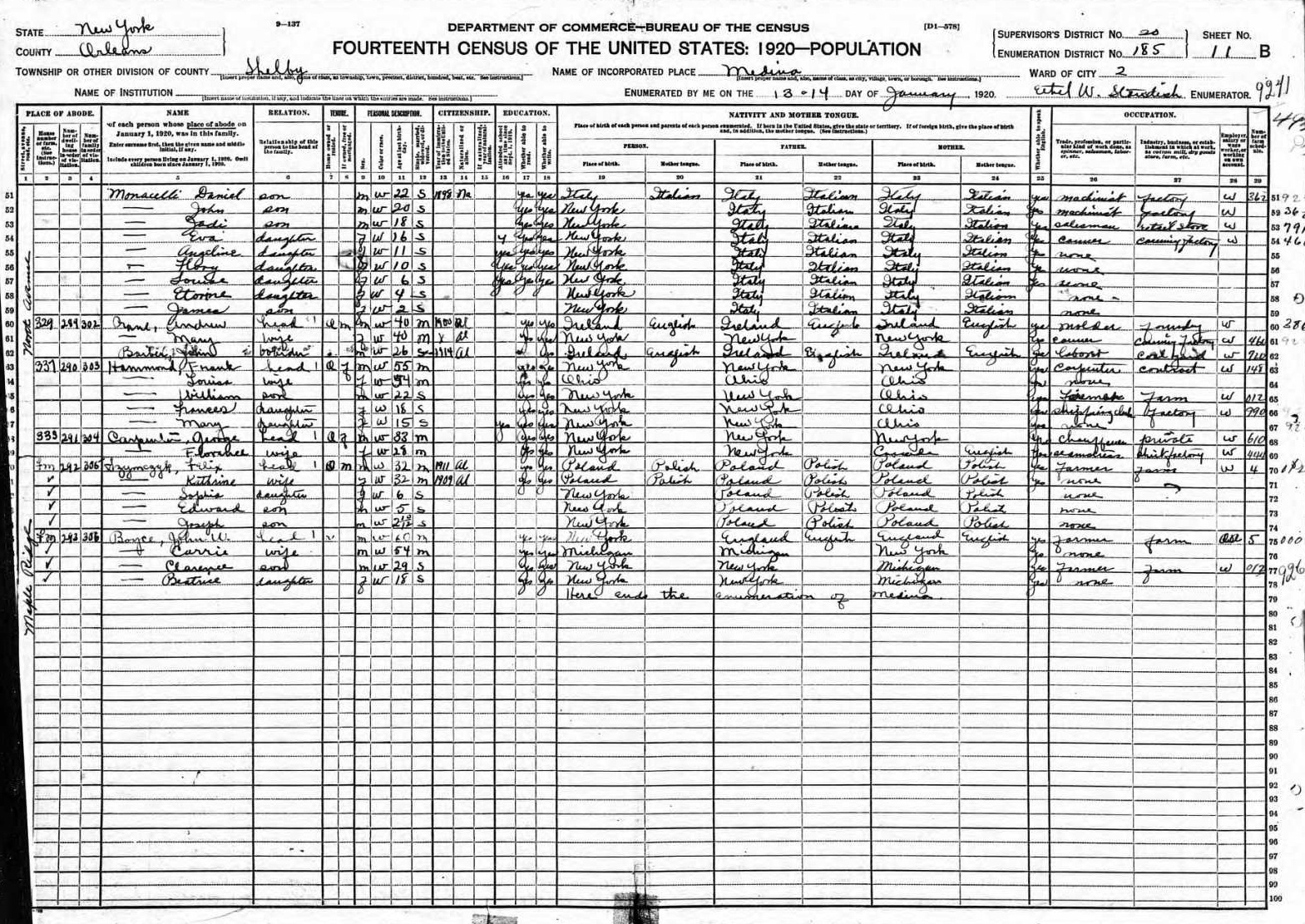 Monacelli Family 1920 Federal Census New York, Lines 51-59