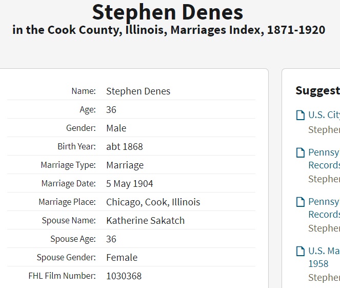 Istvan "Stephen" Dienes were married on May 5, 1904 in Chicago, Cook, Illinois, USA. She died on March 20, 1939, at age 71, in Chicago, Cook, Illinois, USA. She was buried in St. Mary Catholic Cemtery and Mausoleums, Evergreen Park, Illinois.
