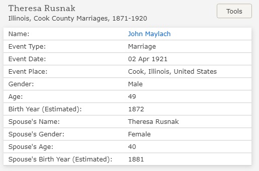 John Maylach were married on April 2, 1921 in Chicago, Cook, Illinois, USA. She died.