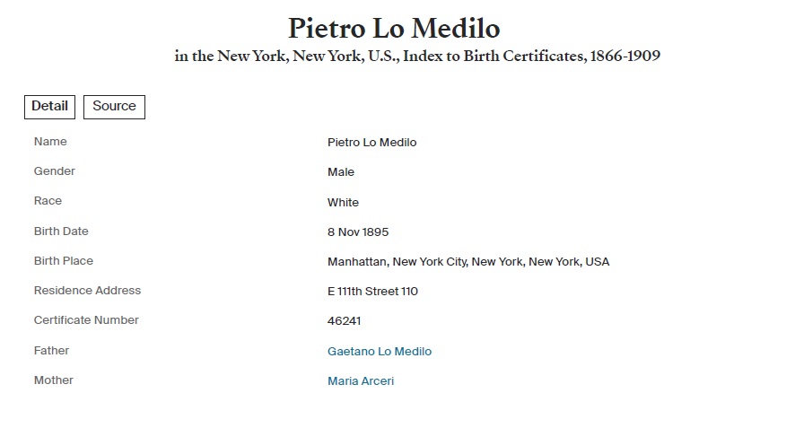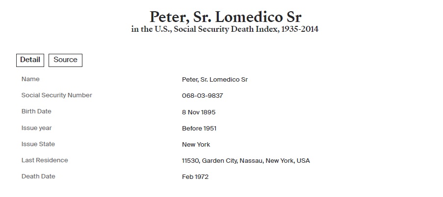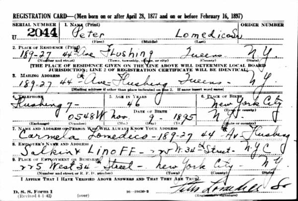 Pietro Lomedico, Sr., was born on November 8, 1895 in Manhattan, New York, USA. He and