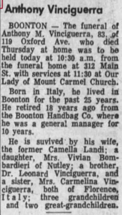 Camella Landi were married in 1911. He died on January 11, 1973, at age 83, in Boonton, Morris, New Jersey, USA. He was buried in Saint Mary's Cemeter, Boonton, New Jersey.