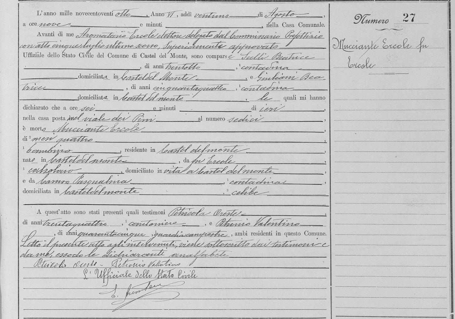 Ercole Mucciante was born in April 1928 in Castel del Monte, L'Aquila, Abruzzo, Italy. He died on August 20, 1928, at age 0, in Castel del Monte, L'Aquila, Abruzzo, Italy.