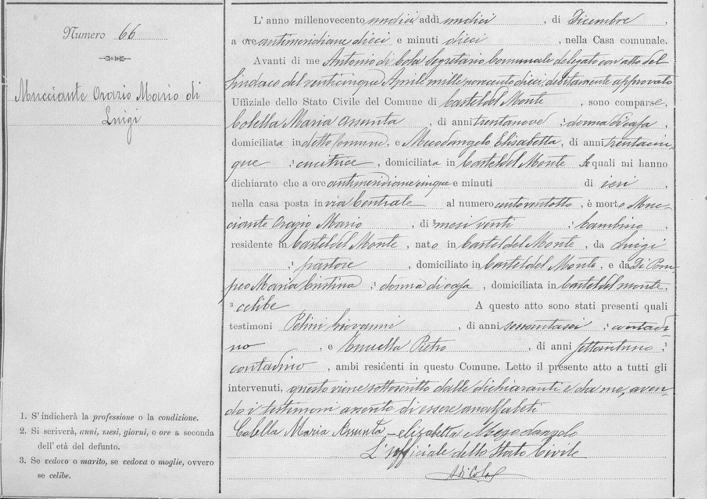 Orazio Mario Mucciante was born in 1910 in Castel del Monte, L'Aquila, Abruzzo, Italy. He died on December 10, 1911, at age ~1, in Castel del Monte, L'Aquila, Abruzzo, Italy.