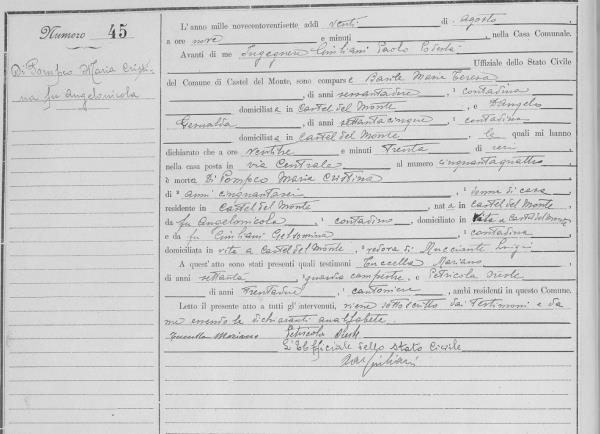 Pasqualina Caruso were married. He died on April 10, 1928, at age ~38, in Castel del Monte, L'Aquila, Abruzzo, Italy.