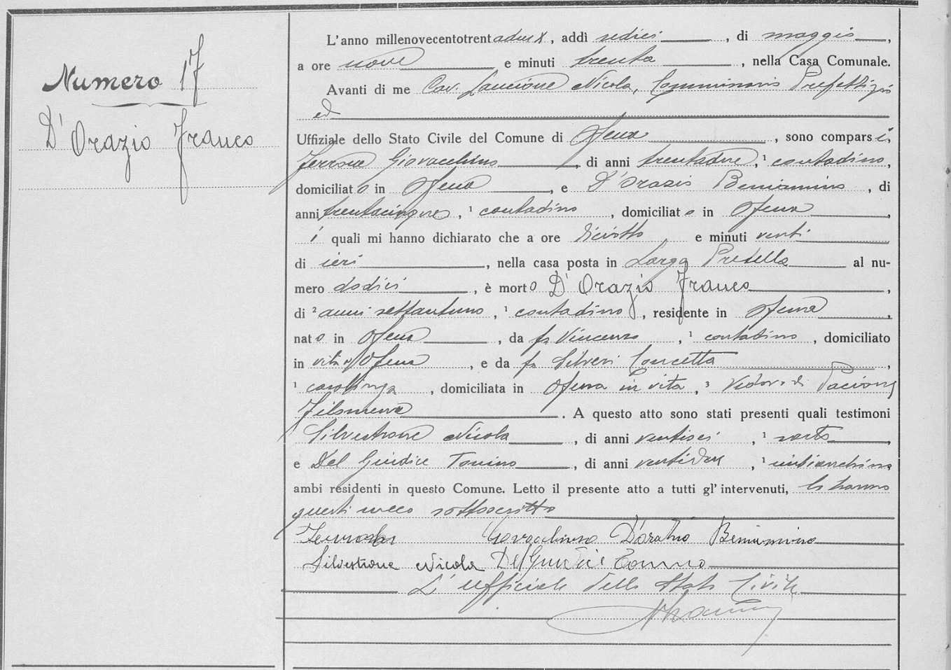 Franco D'Orazio was born in 1861 in Ofena, L'Aquila, Abruzzo, Italy. He and