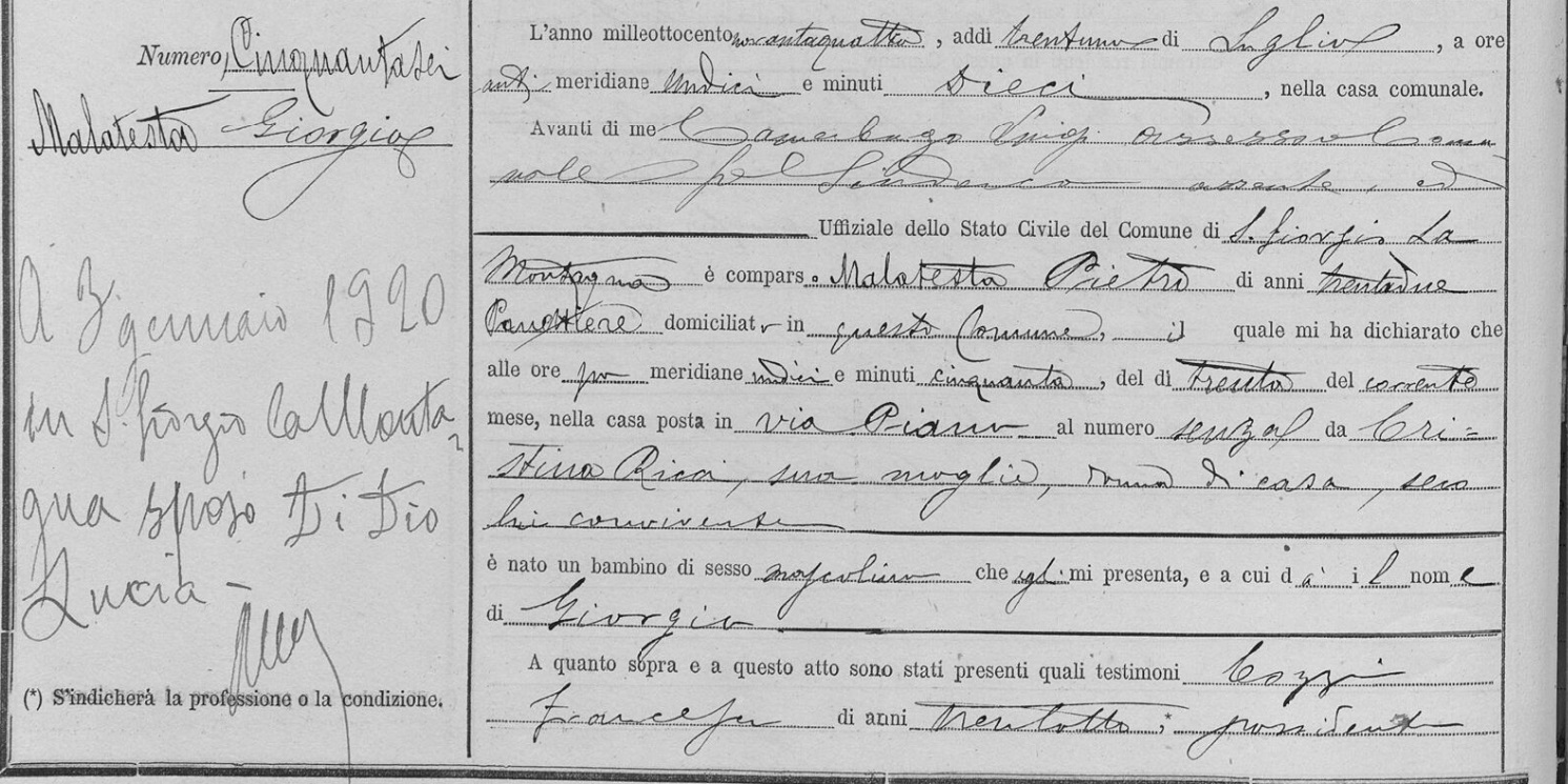 Giorgio Malatesta was born on July 30, 1894 in San Giorgio La Montagna, Benevento, Campania, Italy. He and