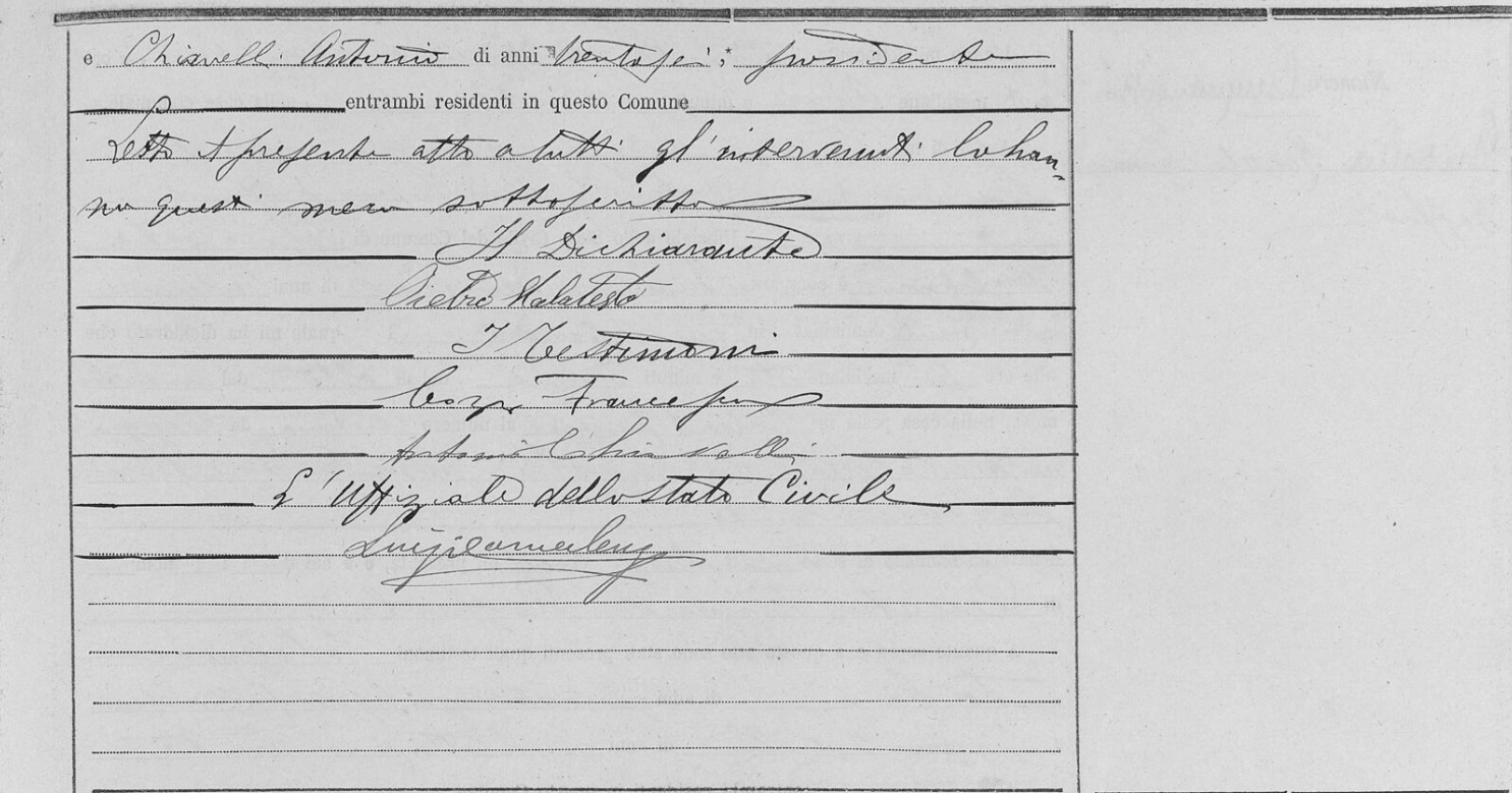 Ercole Melchiorre were married. She died on May 8, 1879, at age ~22, in Bussi sul Tirino, Pescara, Abruzzo, Italy.
