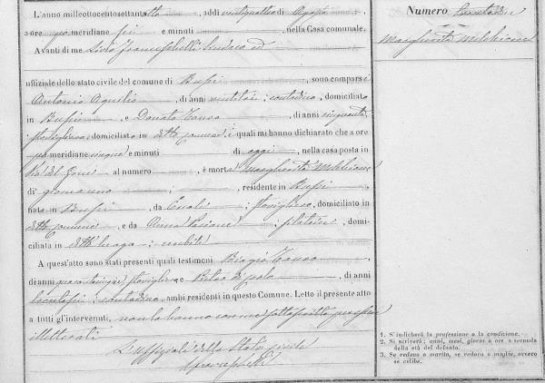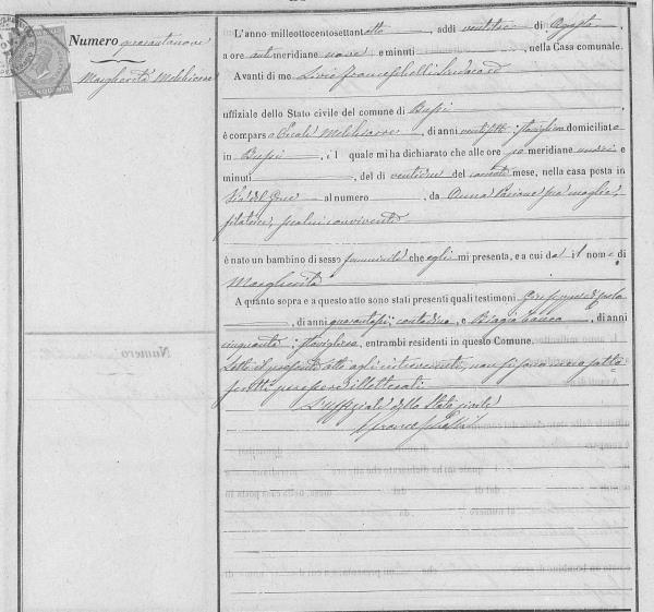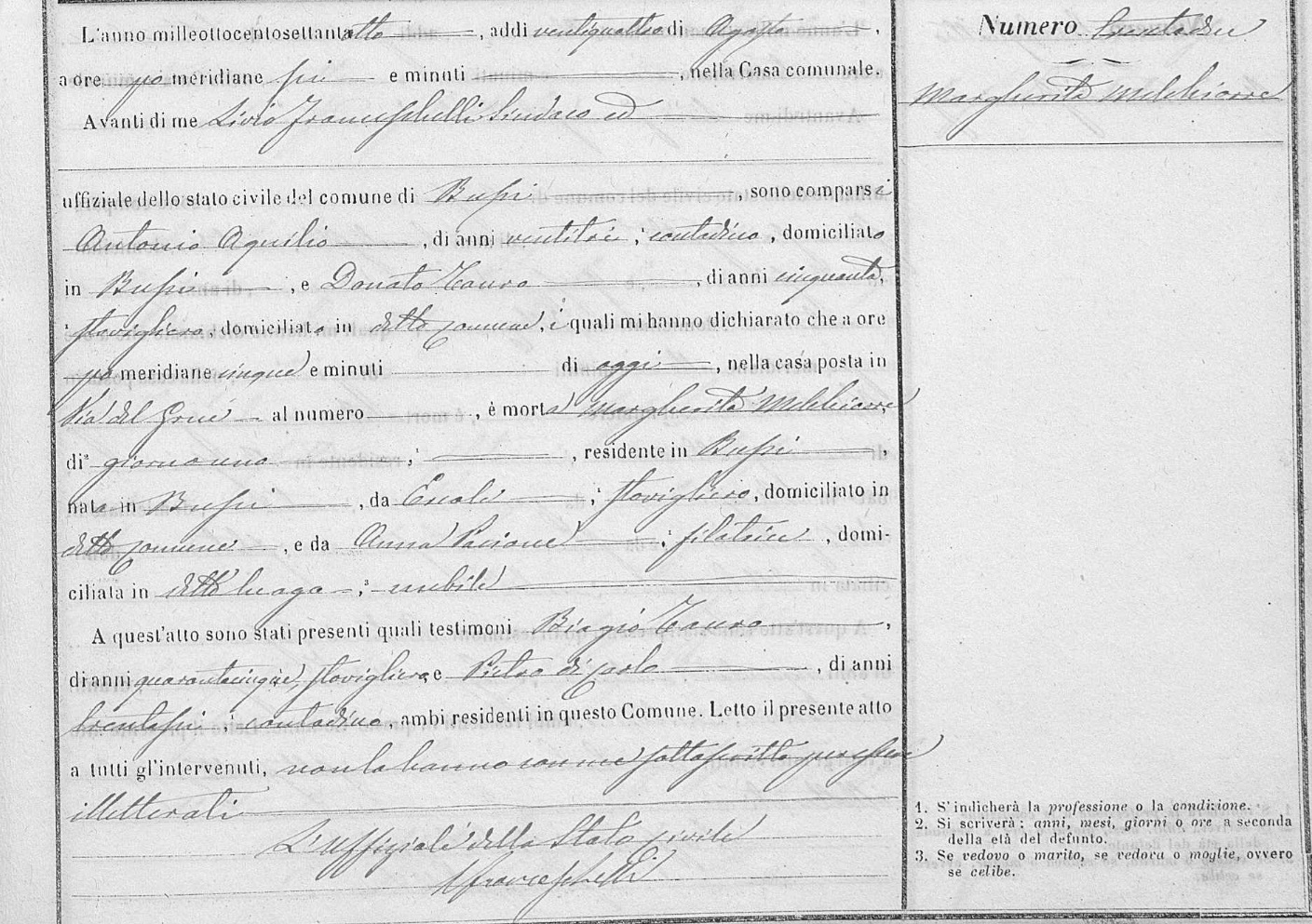 Margherita Melchiorre was born on August 22, 1878 in Bussi sul Tirino, Pescara, Abruzzo, Italy. She died on August 24, 1878, at age 0, in Bussi sul Tirino, Pescara, Abruzzo, Italy.