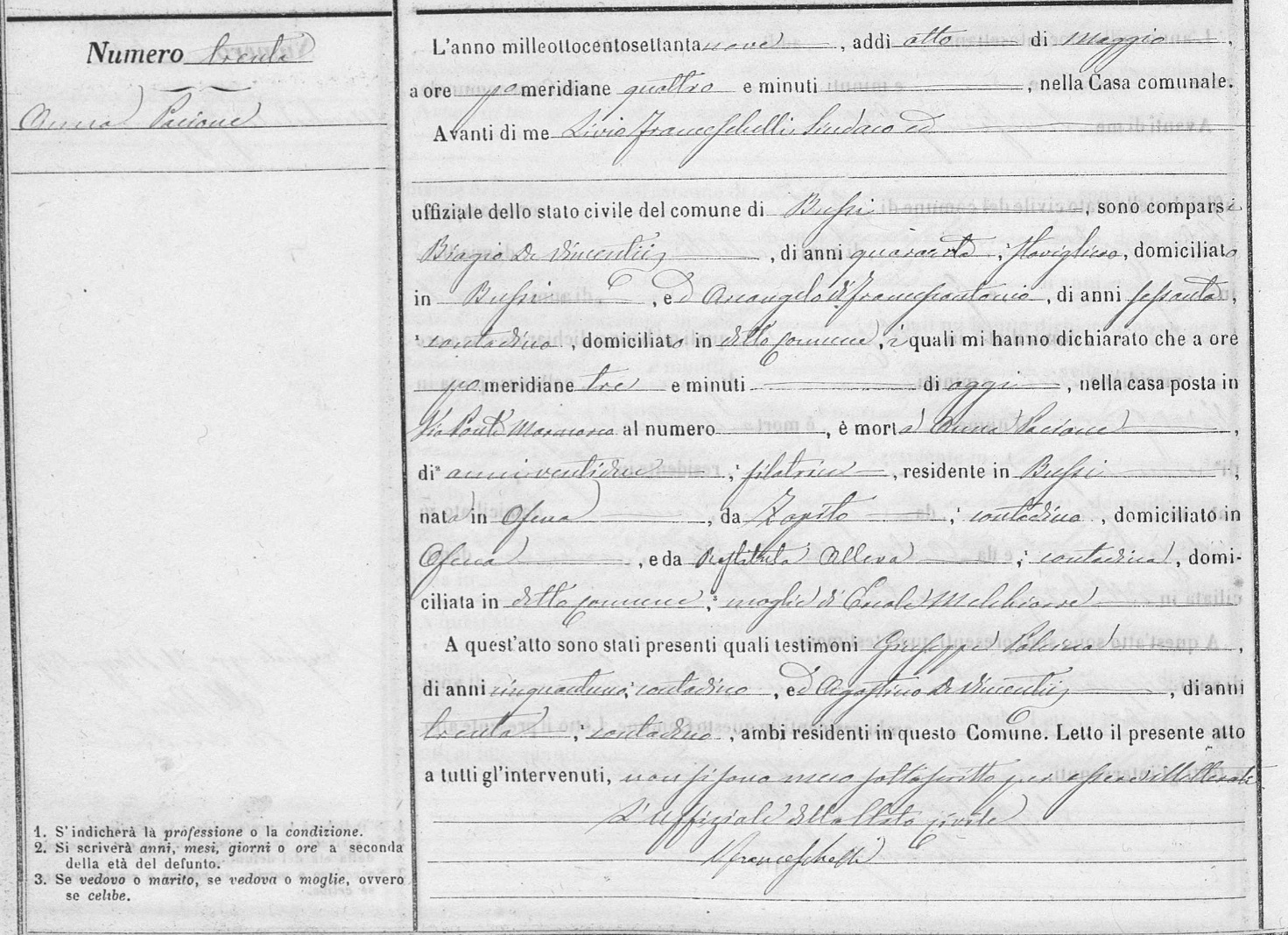 Filomena Pacione were married. He died on May 15, 1932, at age ~71, in Ofena, L'Aquila, Abruzzo, Italy.