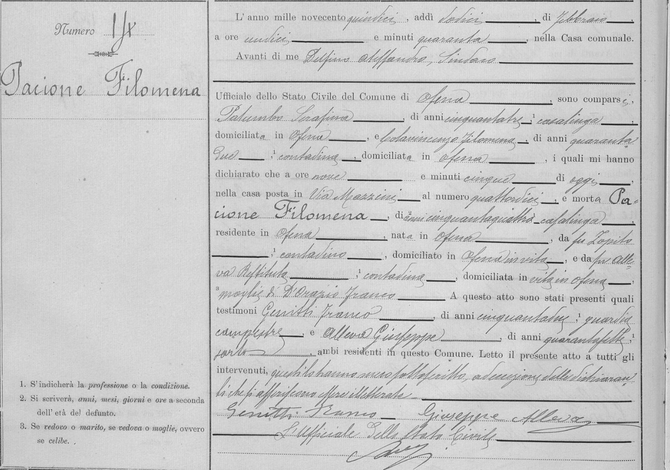 Filomena Pacione was born in 1861 in Ofena, L'Aquila, Abruzzo, Italy. She and