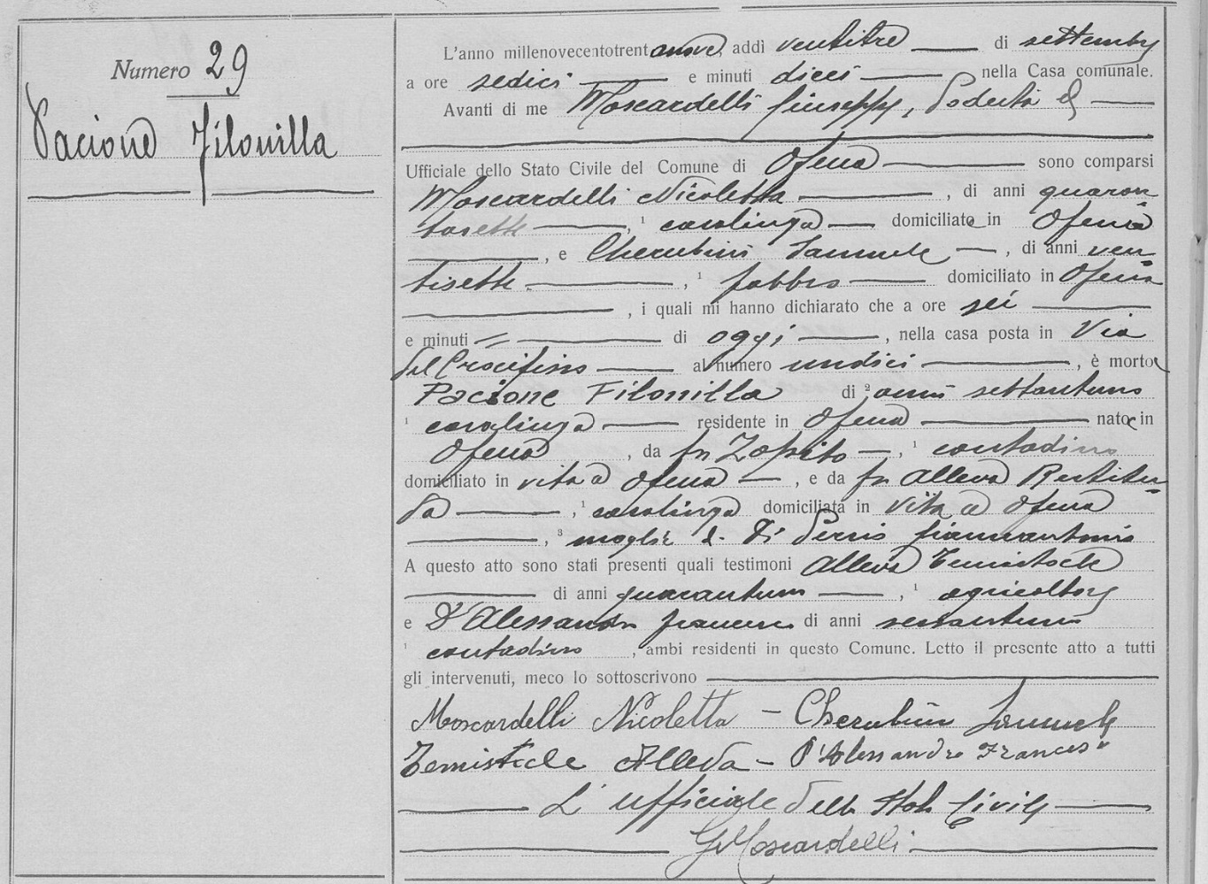 Filonilla Pacione were married. He died on September 7, 1943, at age ~78, in Ofena, L'Aquila, Abruzzo, Italy.