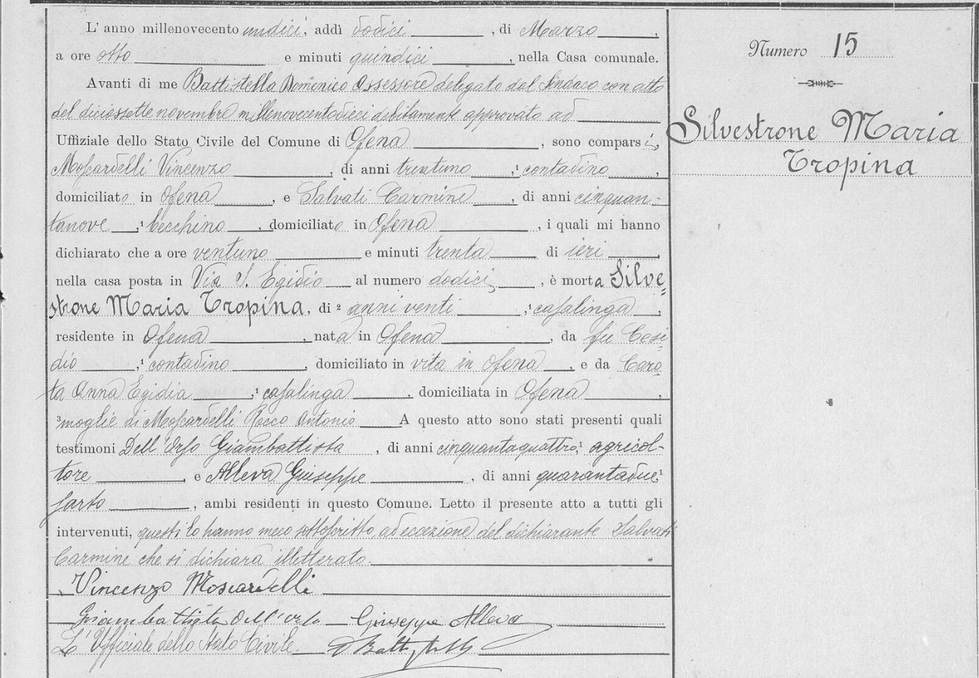 Maria Tropina Silvestrone was born in 1891 in Ofena, L'Aquila, Abruzzo, Italy. She and