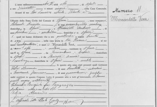 Vera Moscardelli was born in 1925 in Ofena, L'Aquila, Abruzzo, Italy. She died on April 8, 1933, at age ~8, in Ofena, L'Aquila, Abruzzo, Italy.