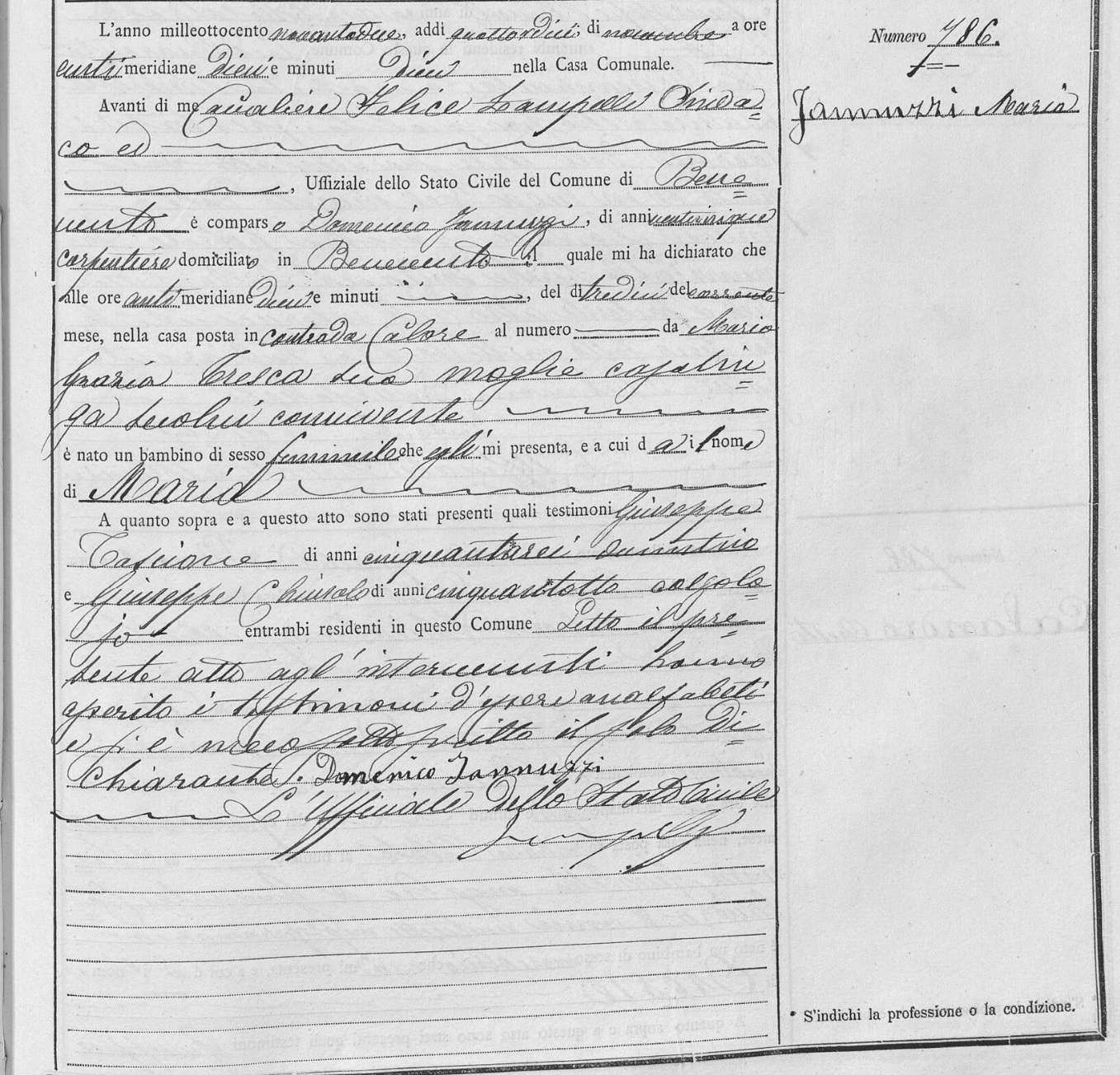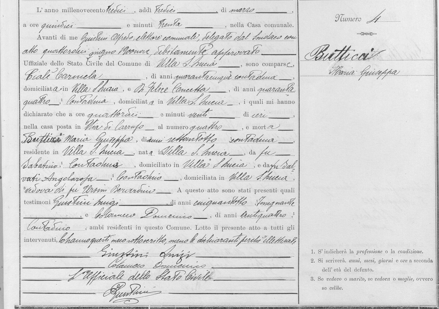 Maria Giuseppa Butticci were married. He died on August 21, 1911, at age ~80, in Villa Santa Lucia Degli Abruzzi, L'Aquila, Abruzzo, Italy.