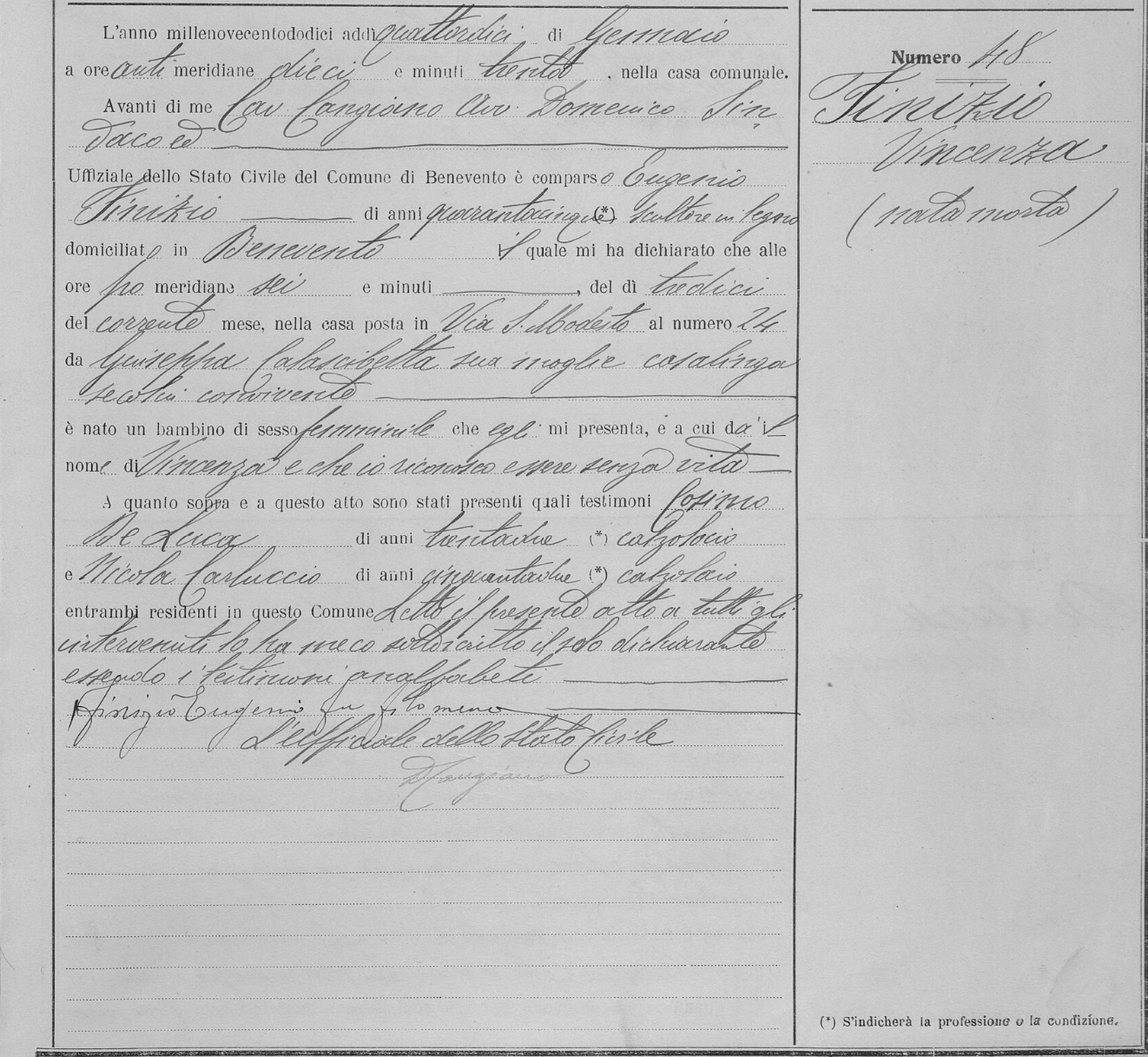 Vincenza Finizio was born on January 13, 1912 in Benevento, Benevento, Campania, Italy. She died on January 13, 1912, at age 0, in Benevento, Benevento, Campania, Italy.