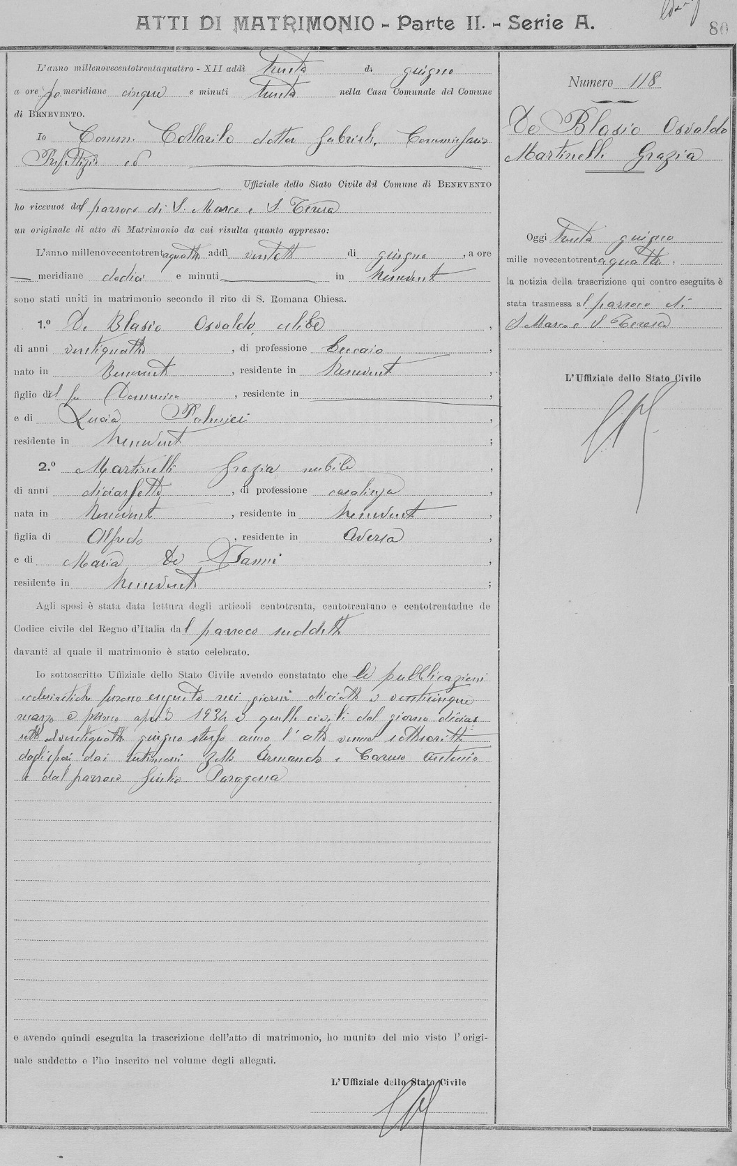Osvaldo De Blasio were married on June 28, 1934 in Benevento, Benevento, Campania, Italy. She died.