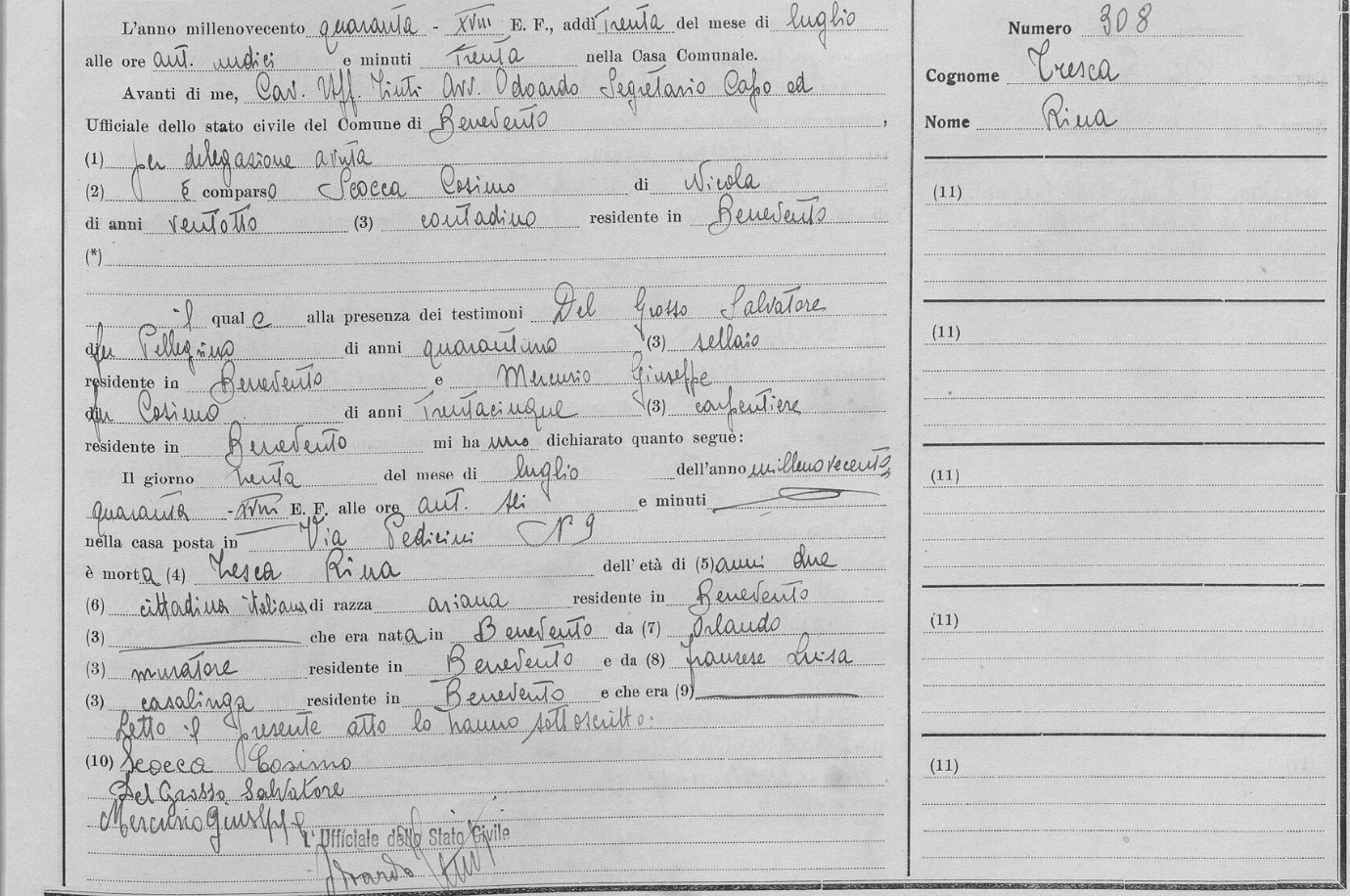 Rina Tresca was born in 1938 in Benevento, Benevento, Campania, Italy. She died on July 30, 1940, at age ~2, in Benevento, Benevento, Campania, Italy.