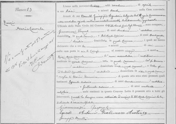 Maria Carmela Quizi were married. He died on November 9, 1936, at age ~74, in Villa Santa Lucia Degli Abruzzi, L'Aquila, Abruzzo, Italy.