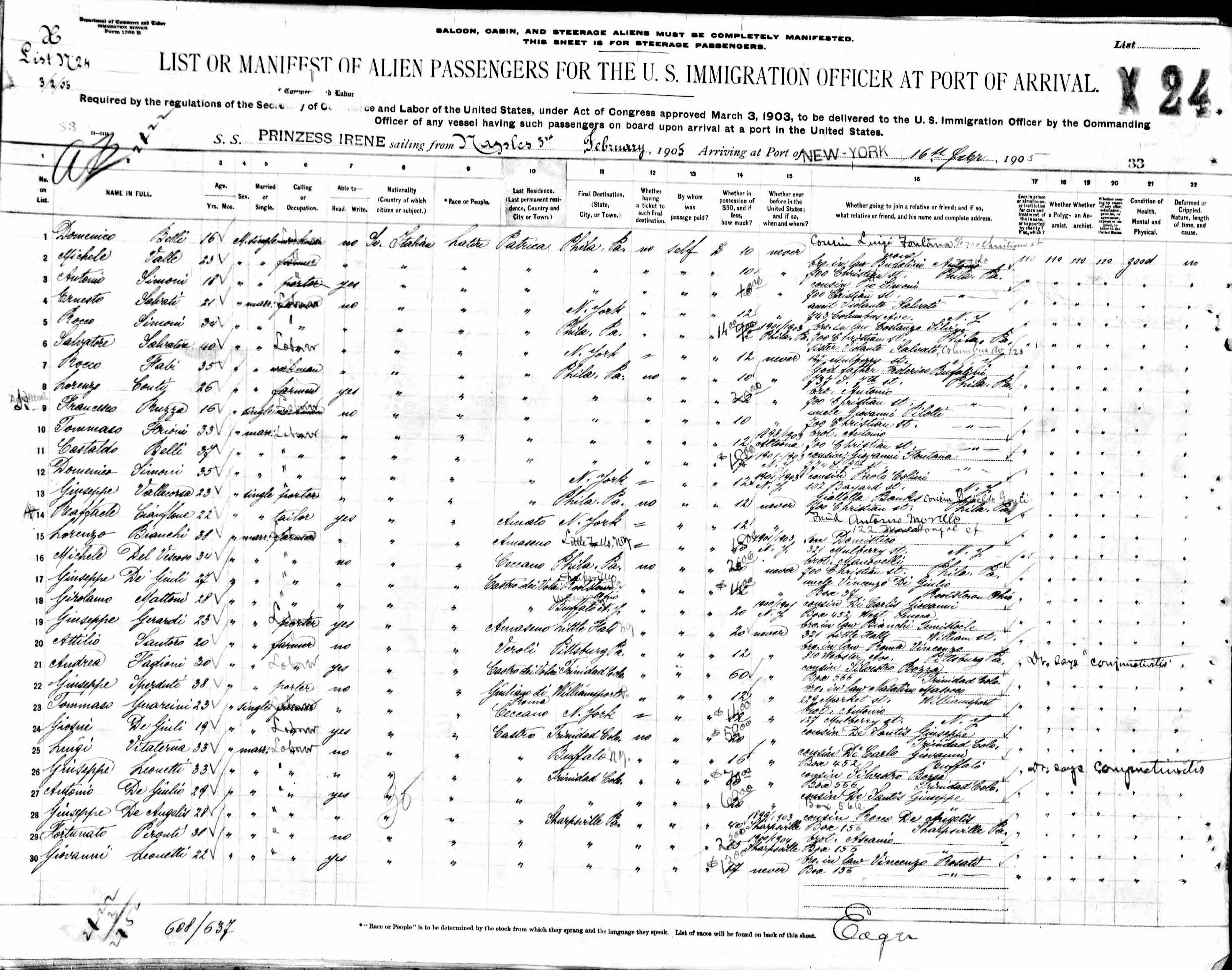 Giuseppe Leonetti 1905 Ship Departure Manifest, Line 26