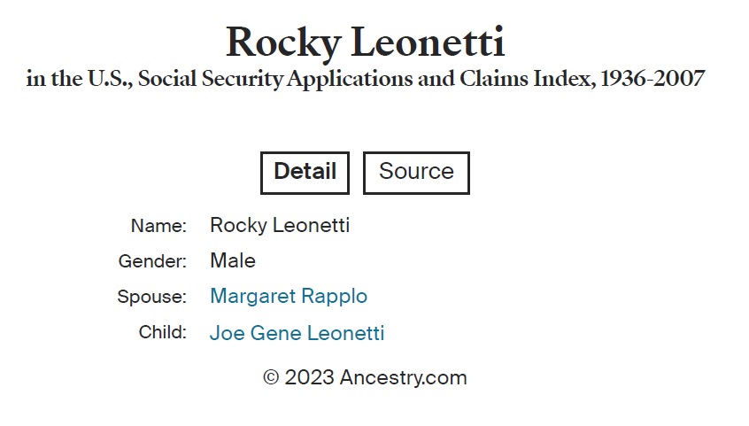 | Son | Rocco "Rocky" Leonetti Born: July 14, 1901, Died: June 30, 1951 |