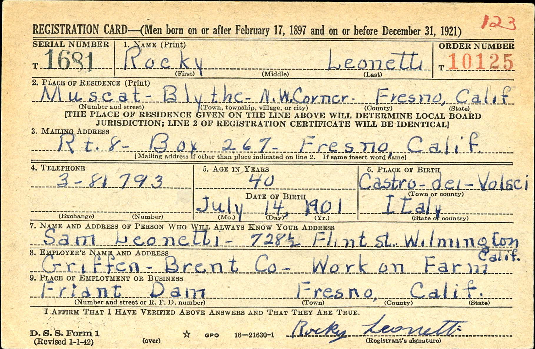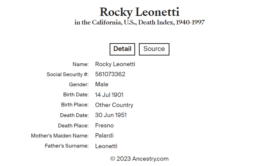 Rocco "Rocky" Leonetti was born on July 14, 1901 in Castro dei Volsci, Frosinone, Lazio, Italy. He and