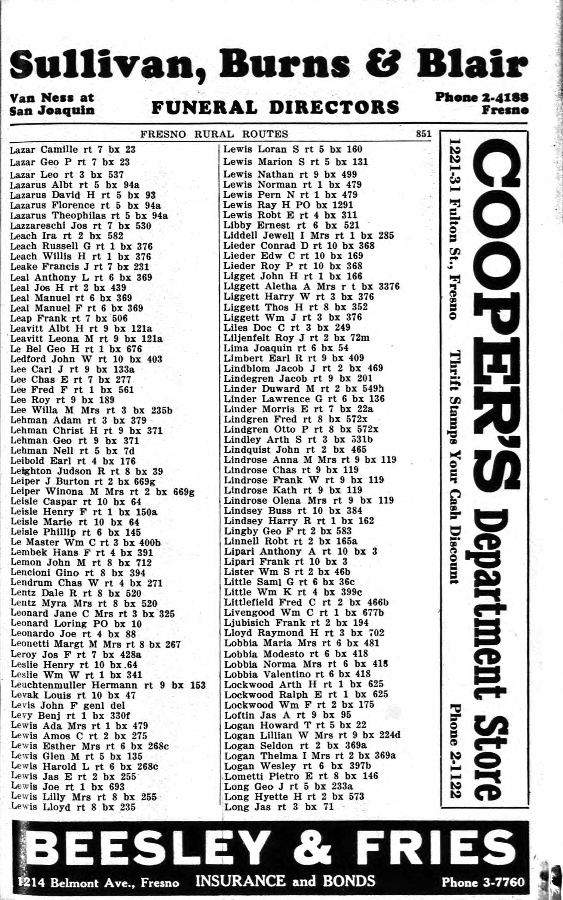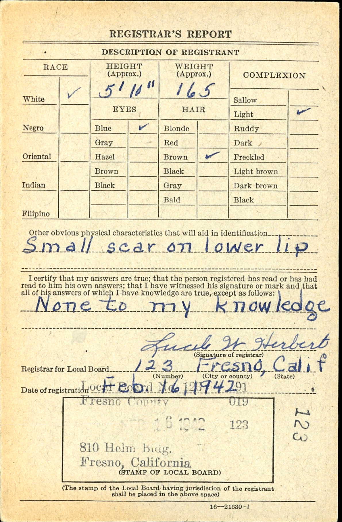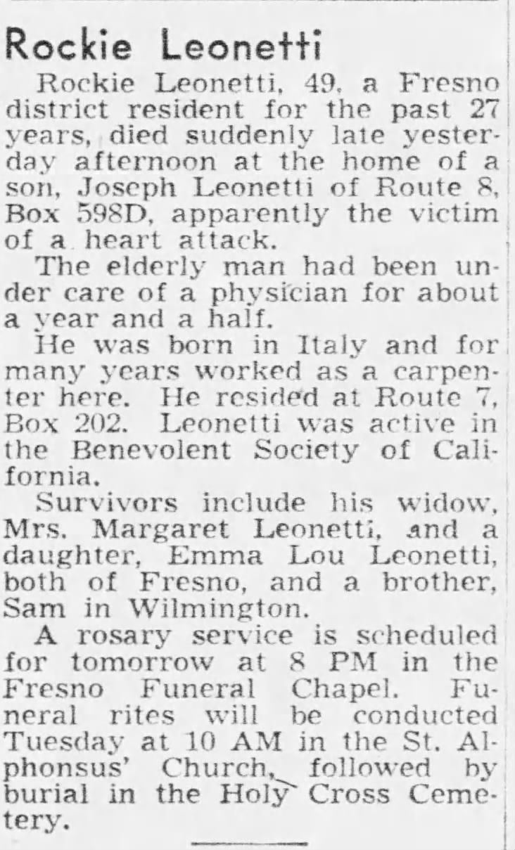 Margaret Rapolla were married. He died on June 30, 1951, at age 49, in Fresno, Fresno, California, USA. He was buried in Holy Cross Cemetery, Fresno, California.
