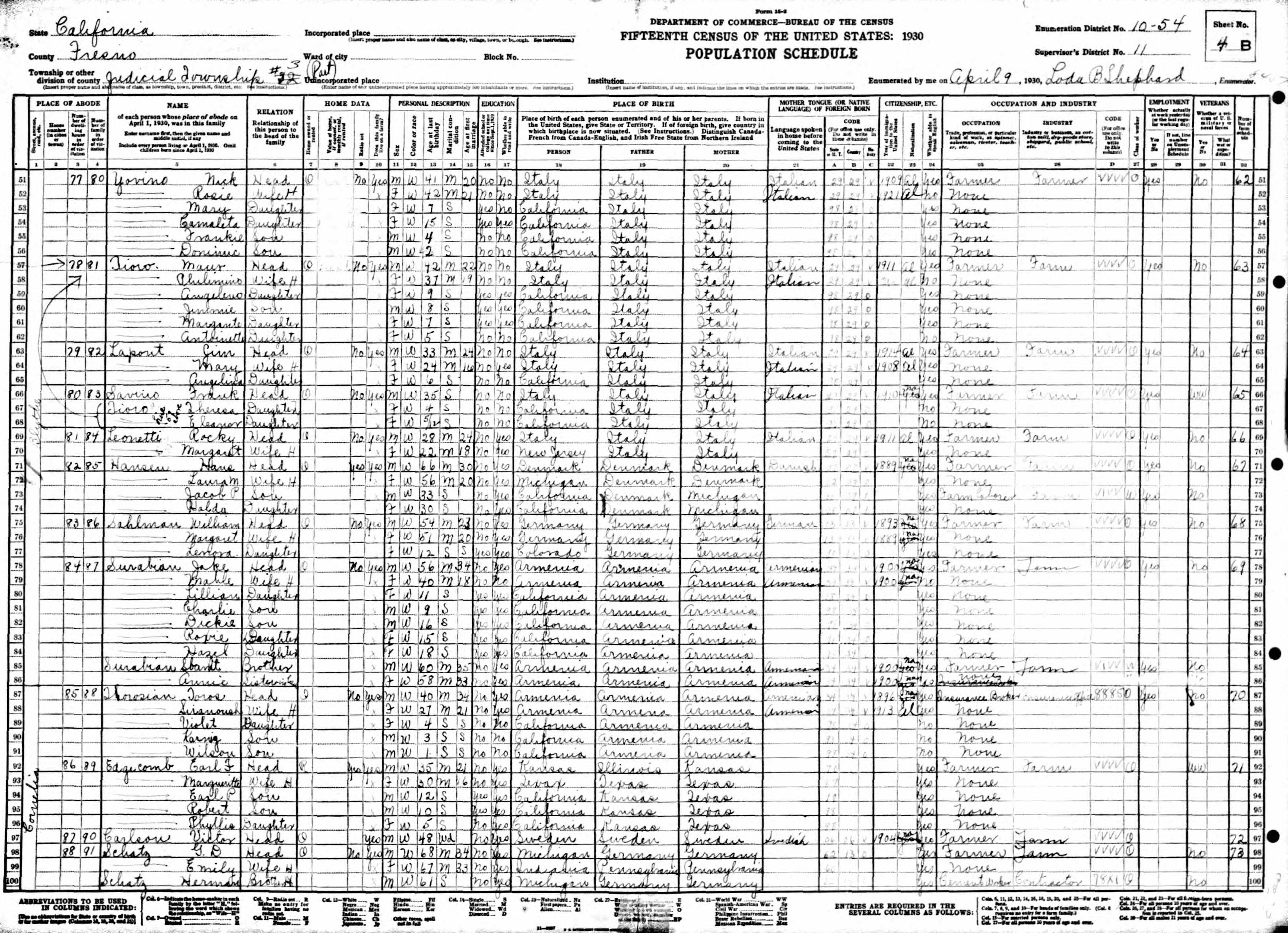 Leonetti Family 1930 Federal Census California, Lines 69-70