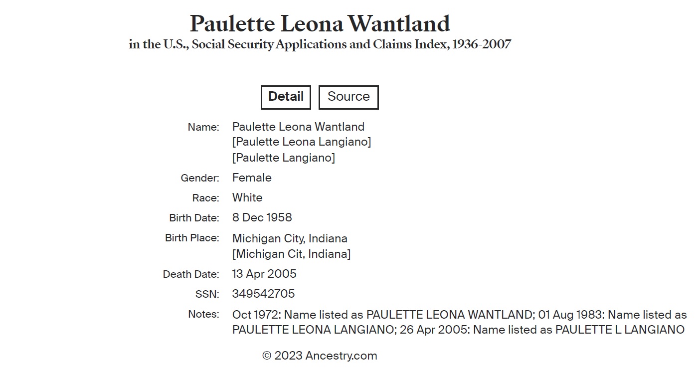 Paulette Leona Wantland was born on December 8, 1958 in Michigan City, LaPorte, Indiana, USA. She and